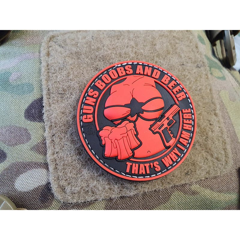 Toppa 3D in plastica con la scritta GUNS BOOBS AND BEER THAT'S WHY I AM HERE (armi, seno e birra, ecco perché sono qui) in nero e rosso con chiusura in velcro. Diametro circa 6 cm.