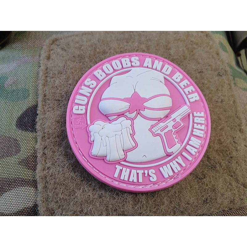 Toppa 3D in plastica con la scritta GUNS BOOBS AND BEER THAT'S WHY I AM HERE (armi, seno e birra, ecco perché sono qui) in rosa e bianco con chiusura in velcro. Diametro circa 6 cm.