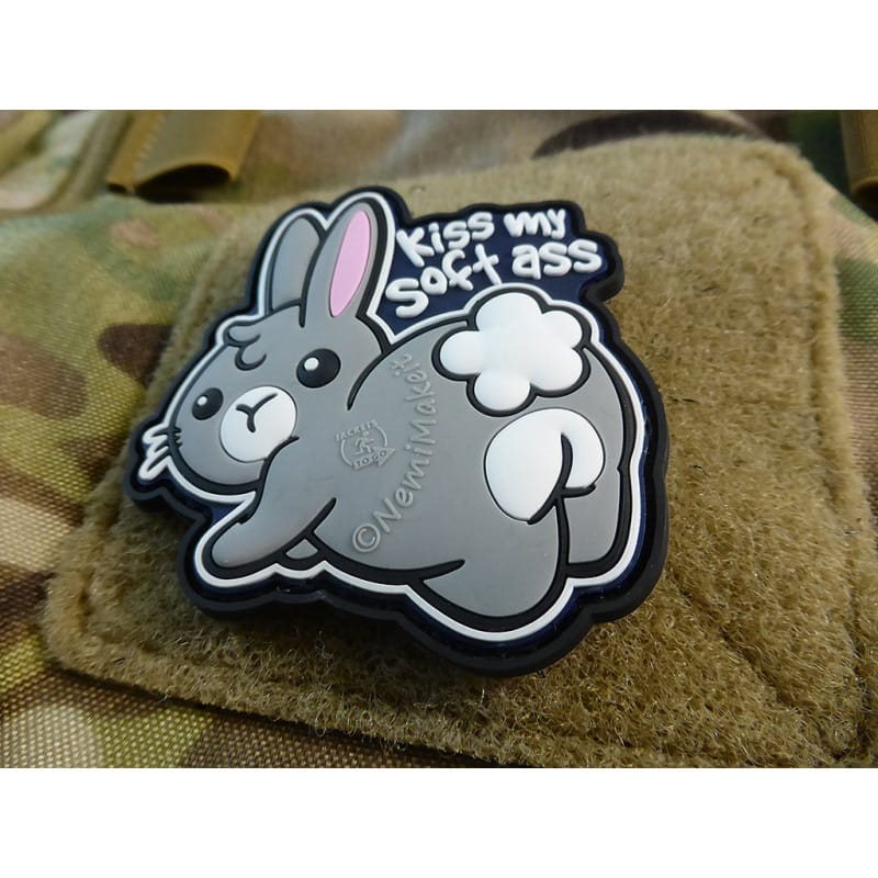 Toppa in plastica, con velcro sul retro e immagine di un coniglio con la scritta Kiss my soft ass (baciami il mio morbido fondoschiena).
