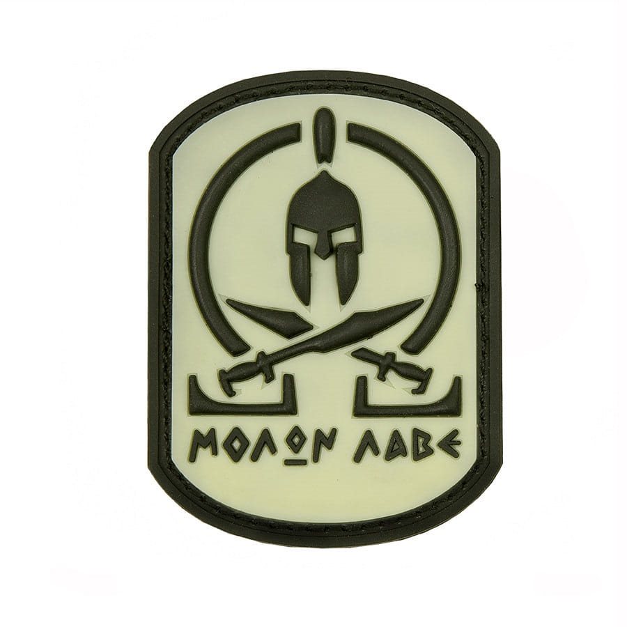 Toppa in plastica con motivo "MOLON LABE". Dimensioni circa 5,3 x 7 cm, con velcro sul retro.