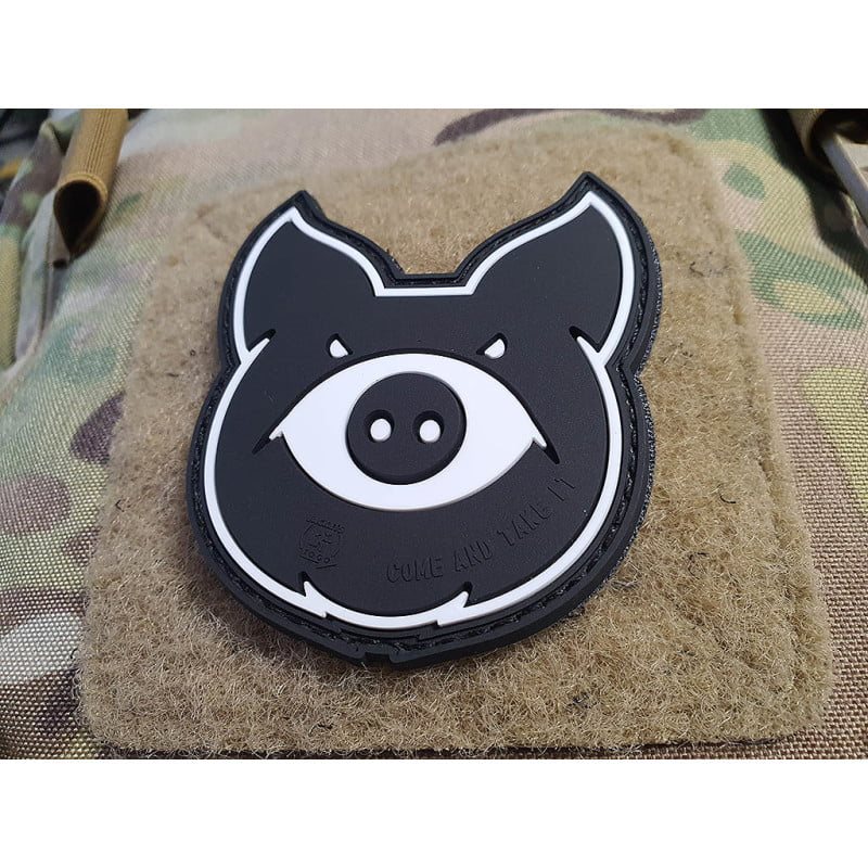 Il motivo principale della toppa è una testa di maiale nera, con la scritta "COME AND TAKE IT" (vieni e prendilo) nella parte inferiore.
