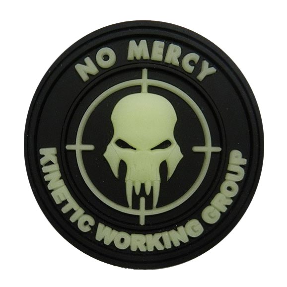 Toppa in plastica con motivo a forma di teschio al centro di un bersaglio e scritta "No Mercy - Kinetic Working Group". Diametro circa 6 cm, con velcro sul retro. Glow in the dark - si illumina al buio.