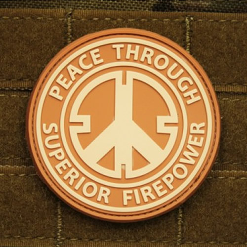 Toppa in plastica con il motivo "Peace through superior firepower". Diametro circa 6 cm, con velcro sul retro.