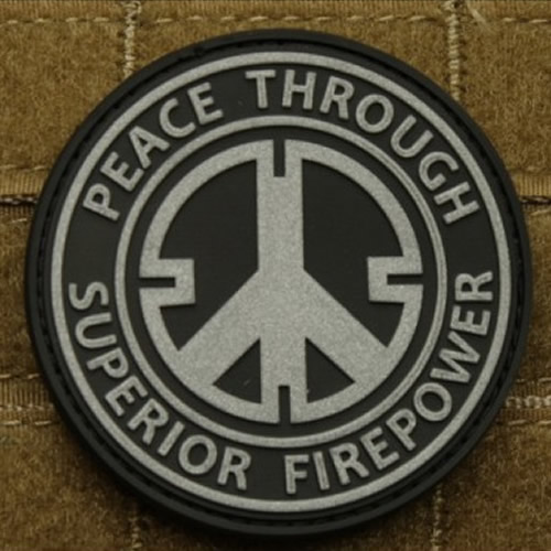 Toppa in plastica con il motivo "Peace through superior firepower". Diametro circa 6 cm, con velcro sul retro.