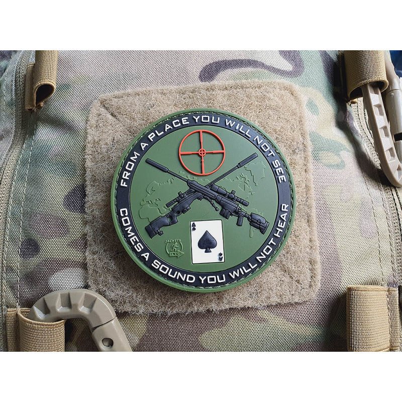 Nella parte superiore è raffigurato un mirino, al centro due fucili incrociati e sotto di essi un asso di picche. Sul bordo è riportata la scritta "From a place you will not see comes a sound you will not hear" (Da un luogo che non vedrai arriva un suono che non sentirai). Dimensioni: diametro 7,5 cm.