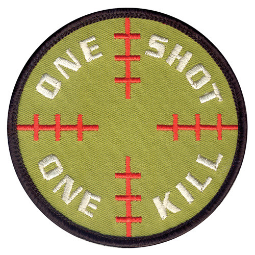 Toppa rotonda con velcro con scritta bianca ONE SHOT ONE KILL su sfondo verde con bordo nero. Diametro della toppa 8 cm. Ulteriori informazioni