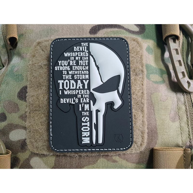 Qualitativa toppa 3D in PVC flessibile con motivo a teschio e scritta "The devil whispered in my ear, you're not strong enough to withstand the storm today. Ho sussurrato all'orecchio del diavolo che io sono la tempesta." (Il diavolo mi ha sussurrato all'orecchio che non sono abbastanza forte per resistere alla tempesta di oggi. Ho sussurrato all'orecchio del diavolo che io sono la tempesta.) su velcro)