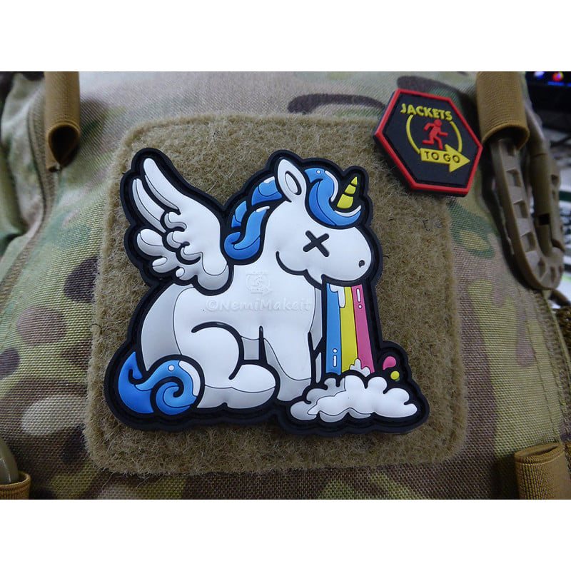 Toppa in plastica con unicorno che vomita arcobaleno. Da applicare su pannello in velcro. Dimensioni 7,5 x 7,2 cm. Materiale: PVC. Ulteriori informazioni