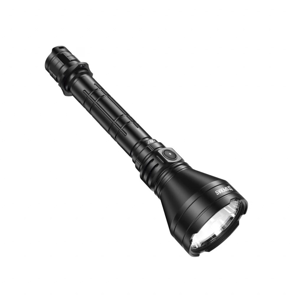 Potente torcia da caccia che utilizza LED S50 di alta qualità per raggiungere una potenza massima di 1400 lumen con una portata di 1400 metri. Il corpo della torcia è realizzato in resistente lega di alluminio aeronautico con superficie di tipo III che protegge dai graffi e grado di protezione IP68, che garantisce resistenza all'acqua e alla polvere. La testa della torcia è dotata di sporgenze che proteggono la lente e il riflettore da eventuali danni. Per cambiare modalità, la torcia è dotata di un pulsante di comando nella parte inferiore. Questo pulsante è largo 18 mm e gommato in modo da poter essere facilmente azionato anche con i guanti. Sono disponibili in totale sei modalità di illuminazione.