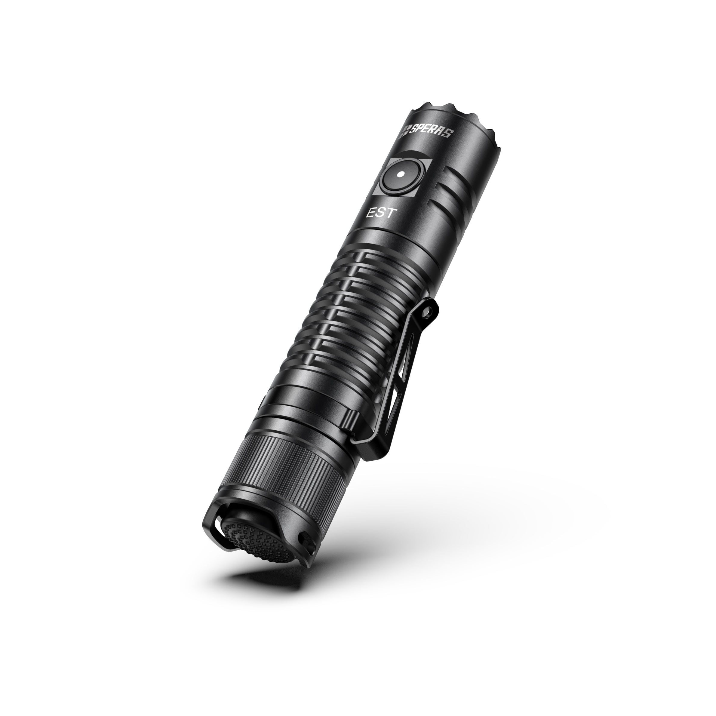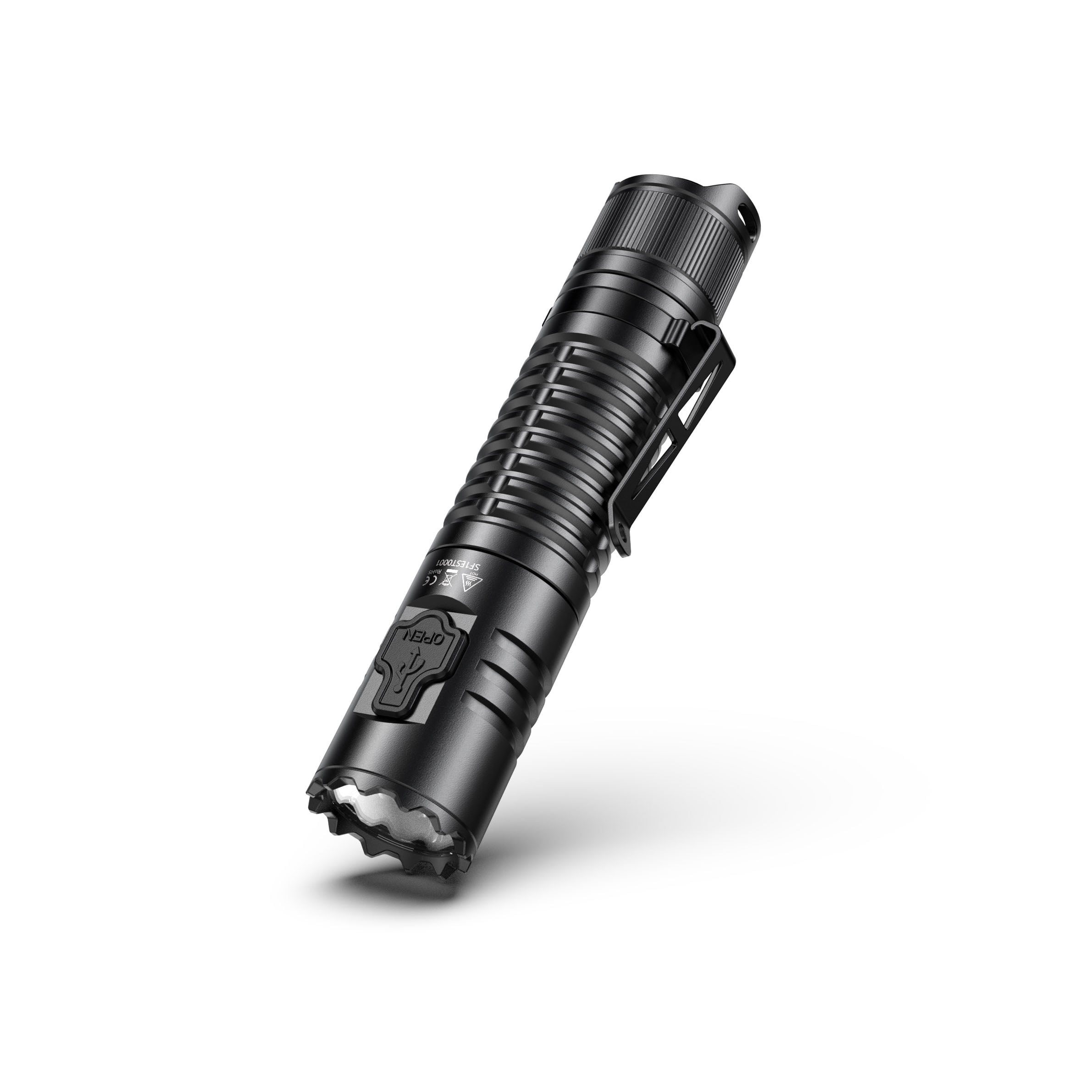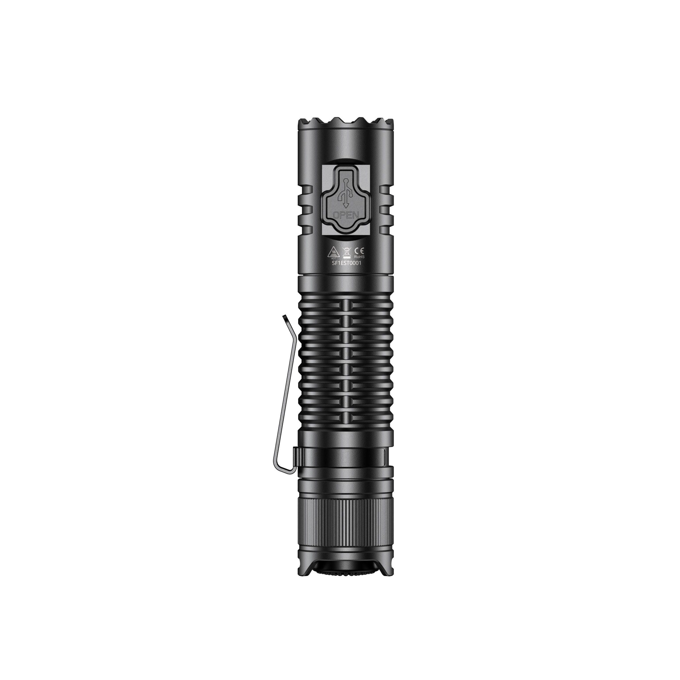 La torcia può essere alimentata con una batteria di tipo 18650 o due batterie di tipo CR123A. La torcia viene fornita con una batteria ricaricabile. La ricarica avviene tramite una porta USB C interna con supporto per la ricarica rapida. La torcia è dotata di protezione contro i danni causati da un inserimento errato delle batterie.
