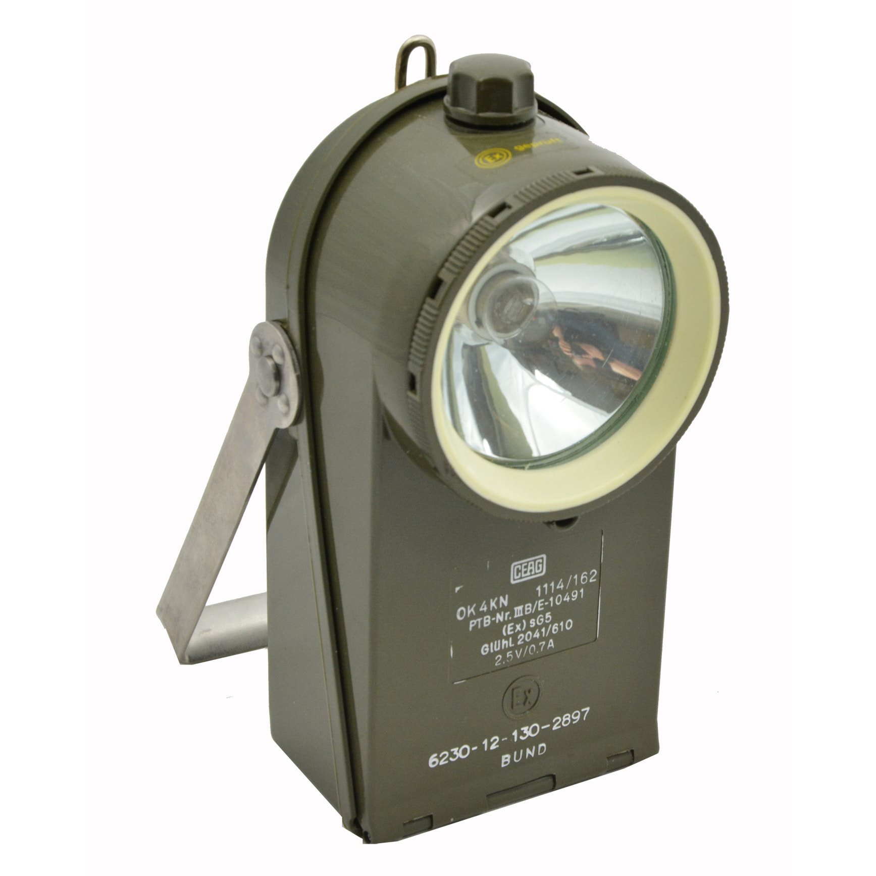 Resistente torcia militare realizzata in plastica antiurto con grado di protezione IP54 e resistenza alle esplosioni secondo (Ex)s G5. Grazie alla maniglia può essere trasportata o utilizzata come una classica lampada da tavolo con possibilità di regolare l'angolo di illuminazione. Nella parte superiore è dotata di un piccolo foro per appenderla e di una pratica clip da cintura. Il pulsante di comando si trova nella parte superiore della lampada.