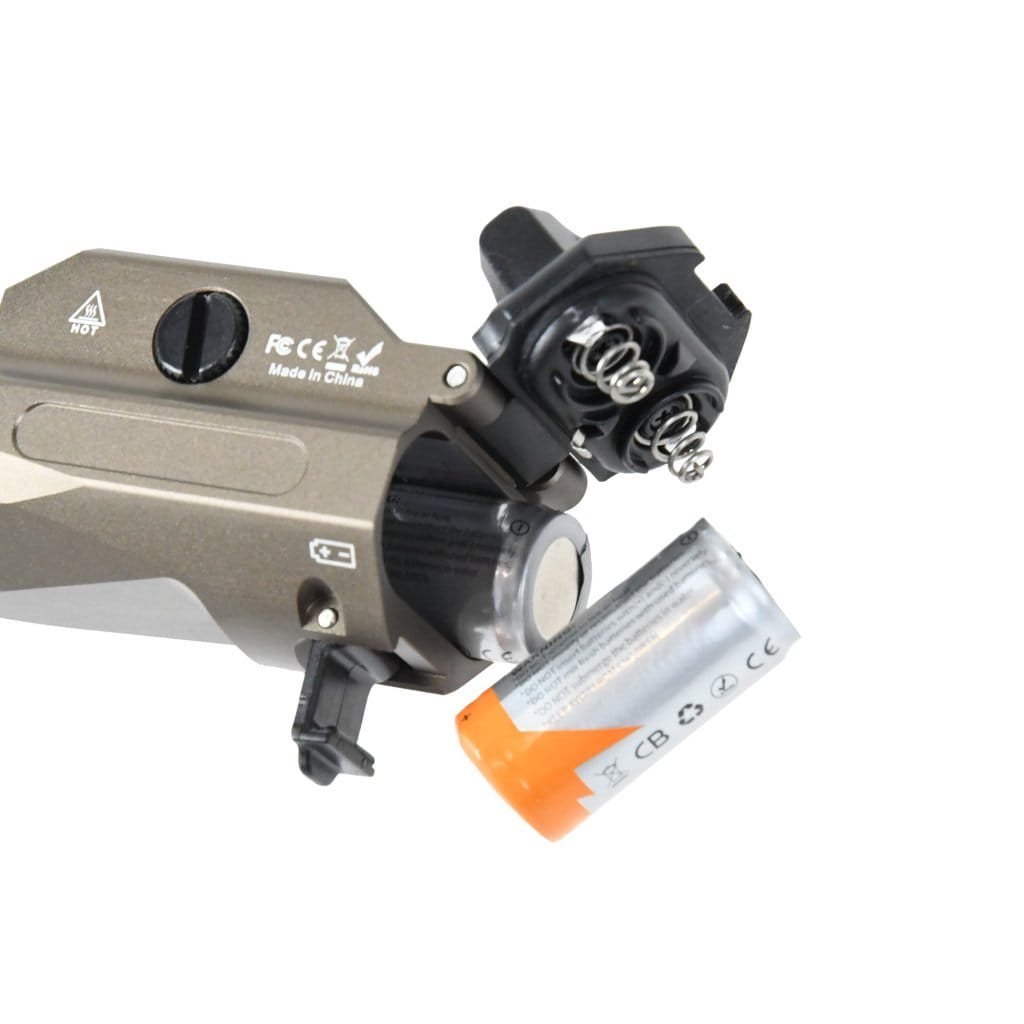 La torcia DAŽBOG PT02 è realizzata in alluminio aeronautico lavorato con macchine CNC. In combinazione con IP65, si tratta di una torcia a pistola resistente, ideale non solo per le armi softair. Il flusso luminoso di 1020 lumen e la portata fino a 220 metri garantiscono un'illuminazione più che sufficiente sia per gli spazi interni che per quelli esterni. L'alimentazione è fornita da due batterie ricaricabili CR123A con caricabatterie incluso.