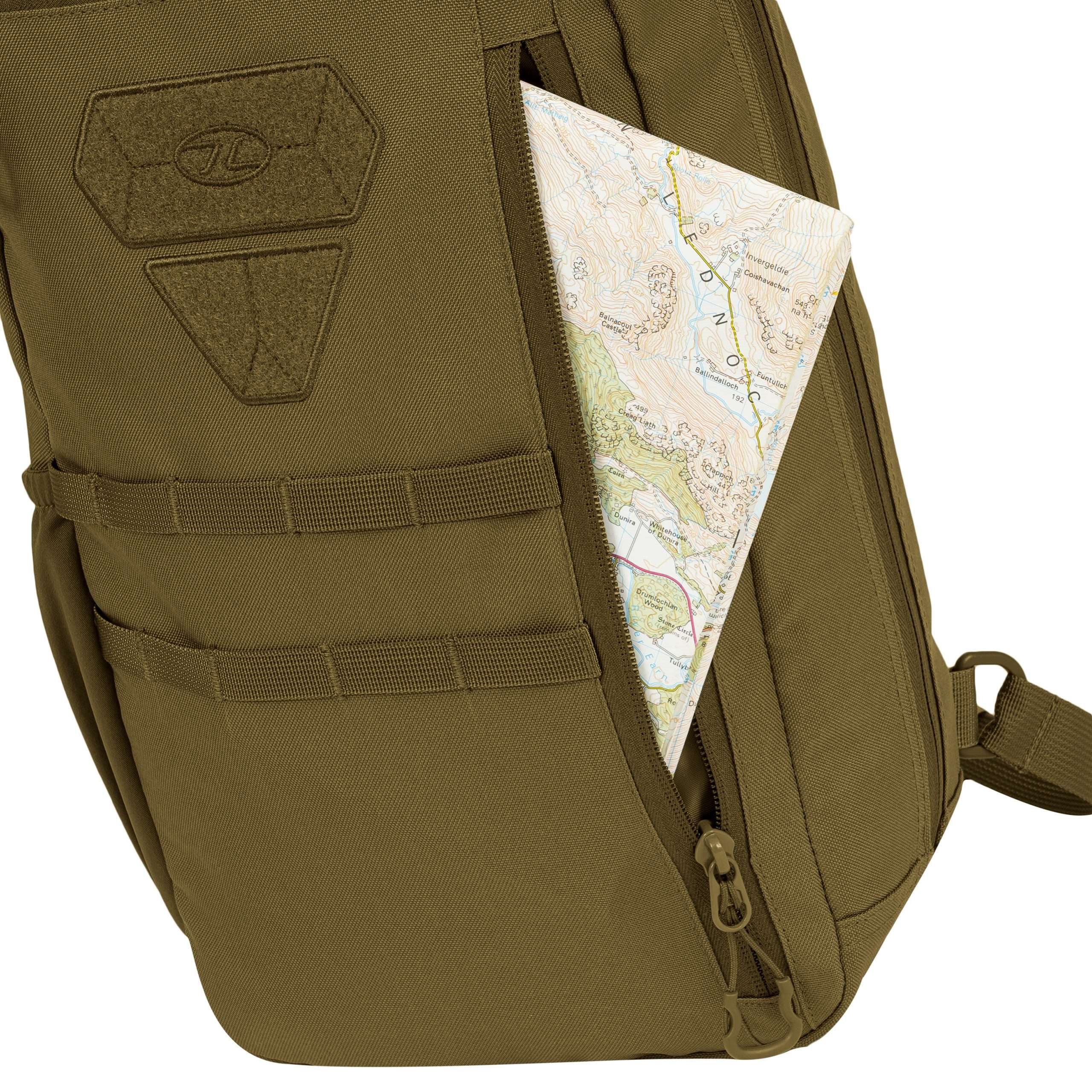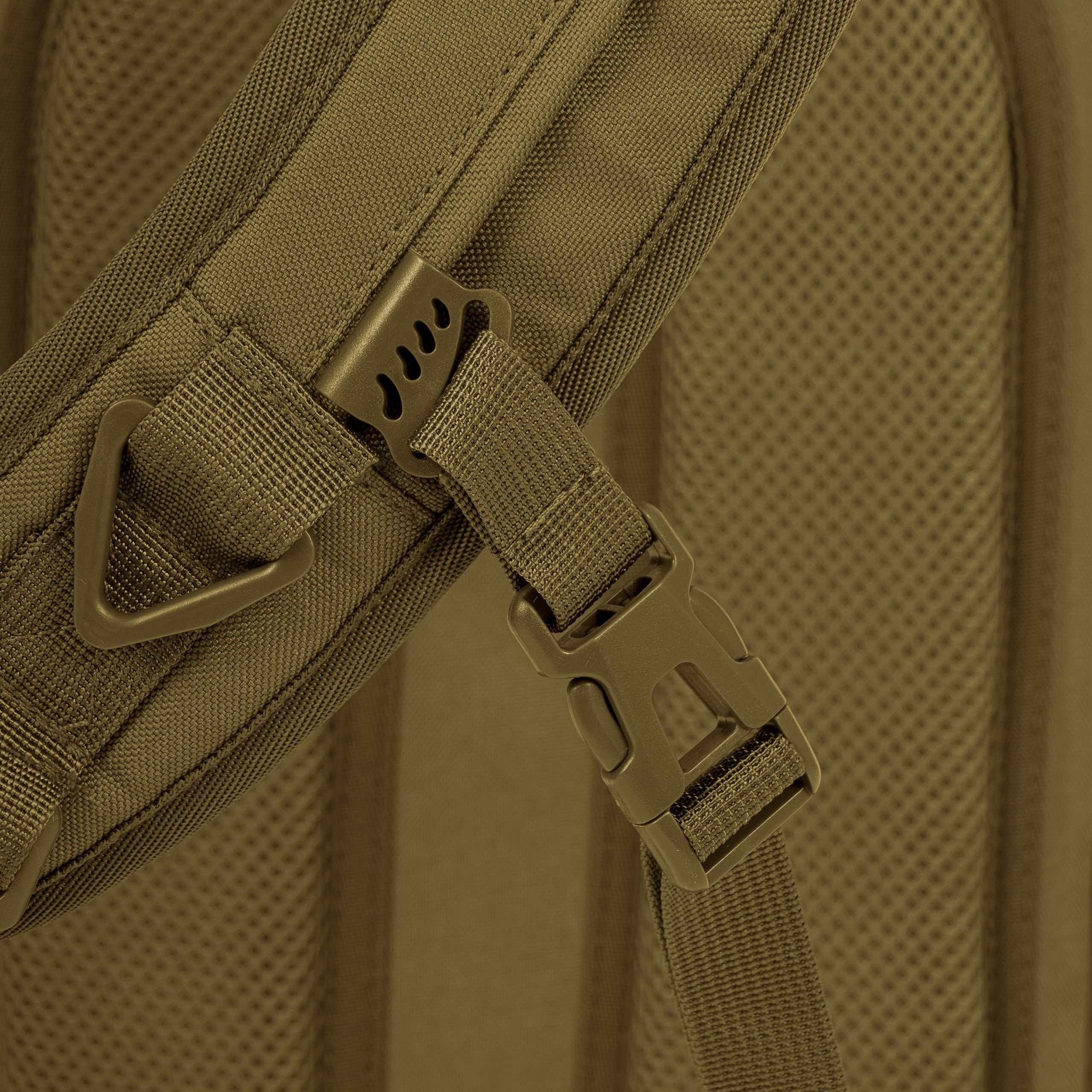 La parte posteriore dello zaino è ampiamente imbottita con rete 3D. La tracolla è regolabile, dotata di un triangolo in plastica e di una piccola cinghia di stabilizzazione regolabile in altezza con fibbia. Ai lati dello zaino sono presenti tasche elastiche per bottiglie e piccoli oggetti. La parte superiore è dotata di una maniglia per il trasporto. Nella parte anteriore sono presenti due file di passanti MOLLE/PALS, due pannelli in VELCRO e una tasca superiore per i documenti. Lo scomparto principale è accessibile tramite una cerniera a doppio cursore. All'interno si trovano una piccola tasca staccabile, uno scomparto con bordo elastico per la sacca idrica e una grande tasca in rete.