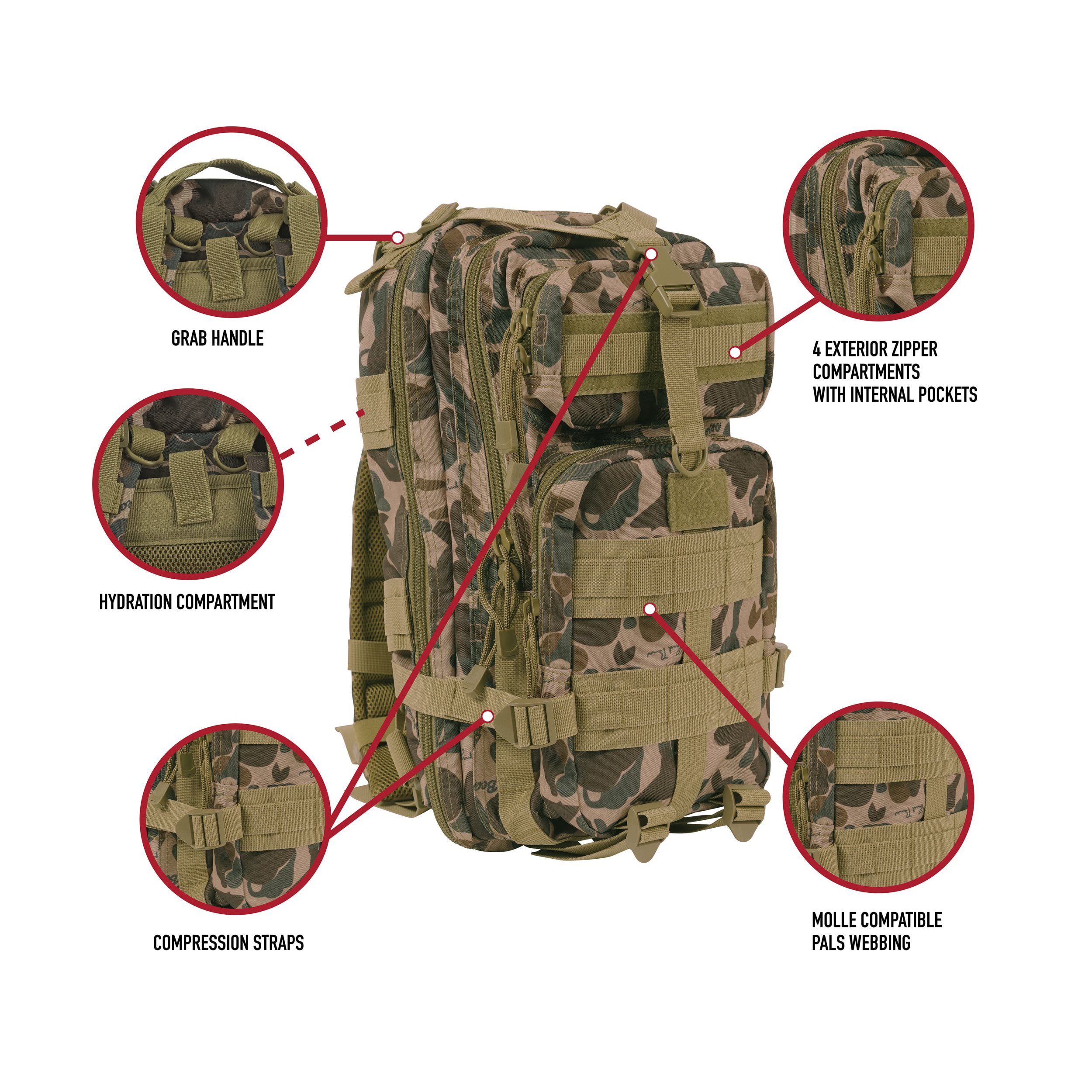 • Zaino tattico con cinghie MOLLE per il fissaggio di ulteriori accessori. Adatto per operazioni di 1-2 giorni.