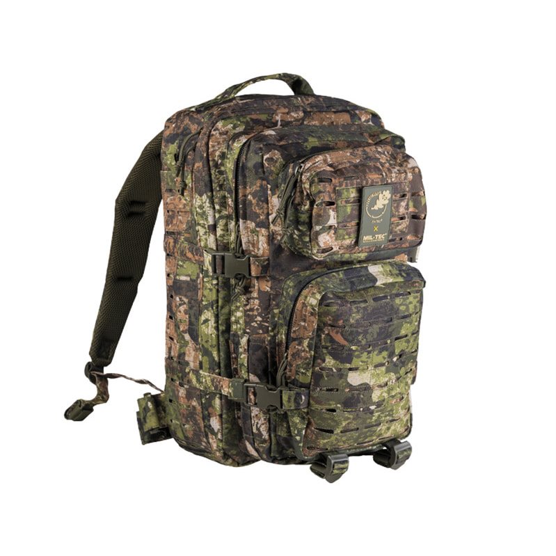 Zaino tattico di medie dimensioni con una capacità di circa 36 litri, prodotto dal rinomato marchio Mil-Tec. Il sistema di aggancio MOLLE appositamente progettato, con occhielli laserati nel tessuto, consente un fissaggio più rapido e semplice di ulteriori custodie MOLLE.