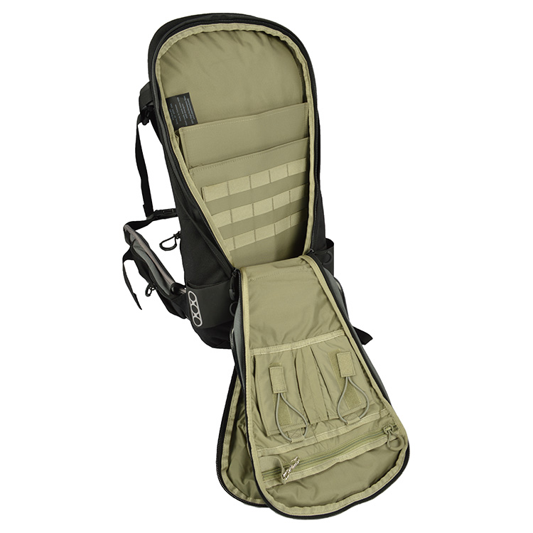 Lo zaino Cherry Bomb è suddiviso in due scomparti principali e una tasca esterna con cerniera dal design ingegnoso. Lo scomparto principale è dotato di una doppia tasca a rete per riporre un'arma, ma può contenere comodamente anche un laptop da 17 o 19 pollici. La seconda tasca è destinata specificamente a un laptop da 15,6 pollici, mentre sul lato opposto sono presenti due tasche per caricatori fissate con un elastico in velcro, una tasca con cerniera e tre scomparti aperti. Il secondo scomparto, più piccolo, è dotato di una tasca per sacca idrica con passaggio per il tubo, mentre sul lato opposto è presente una tasca a rete con cerniera. In entrambi gli scomparti principali sono presenti tre file di passanti PALS per il fissaggio di ulteriori accessori MOLLE.
