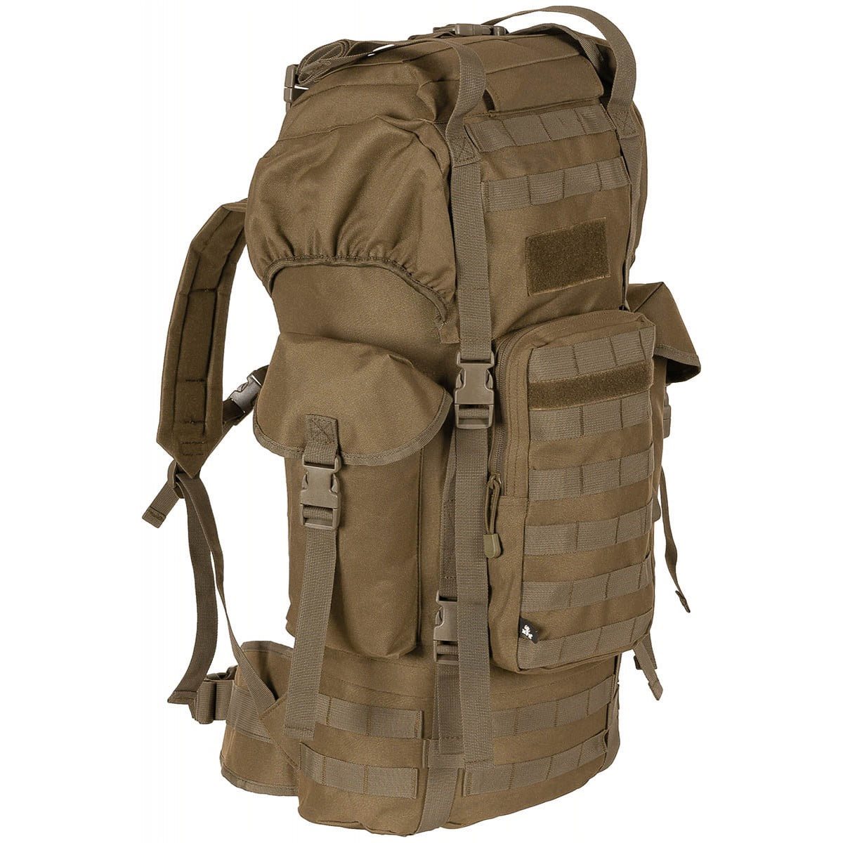 La parte anteriore dello zaino è dotata di un gran numero di attacchi modulari standard MOLLE/PALS, che consentono di aggiungere attrezzature compatibili come tasche, custodie, ecc. Al centro dello zaino si trova una tasca capiente chiusa da una cerniera a senso unico con tiretto. All'esterno è presente una lunga striscia di velcro per le vostre etichette o toppe in velcro. Nella parte inferiore è possibile accedere alla parte inferiore dell'interno dello zaino. Il coperchio è fissato da una coppia di cinghie con fibbie in plastica e dispone di una striscia di velcro, una tasca esterna superiore con patta e una tasca piatta inferiore. Le cinghie anteriori possono essere utilizzate come cinghie di compressione e, se necessario, per fissare piccoli accessori al fondo dello zaino.