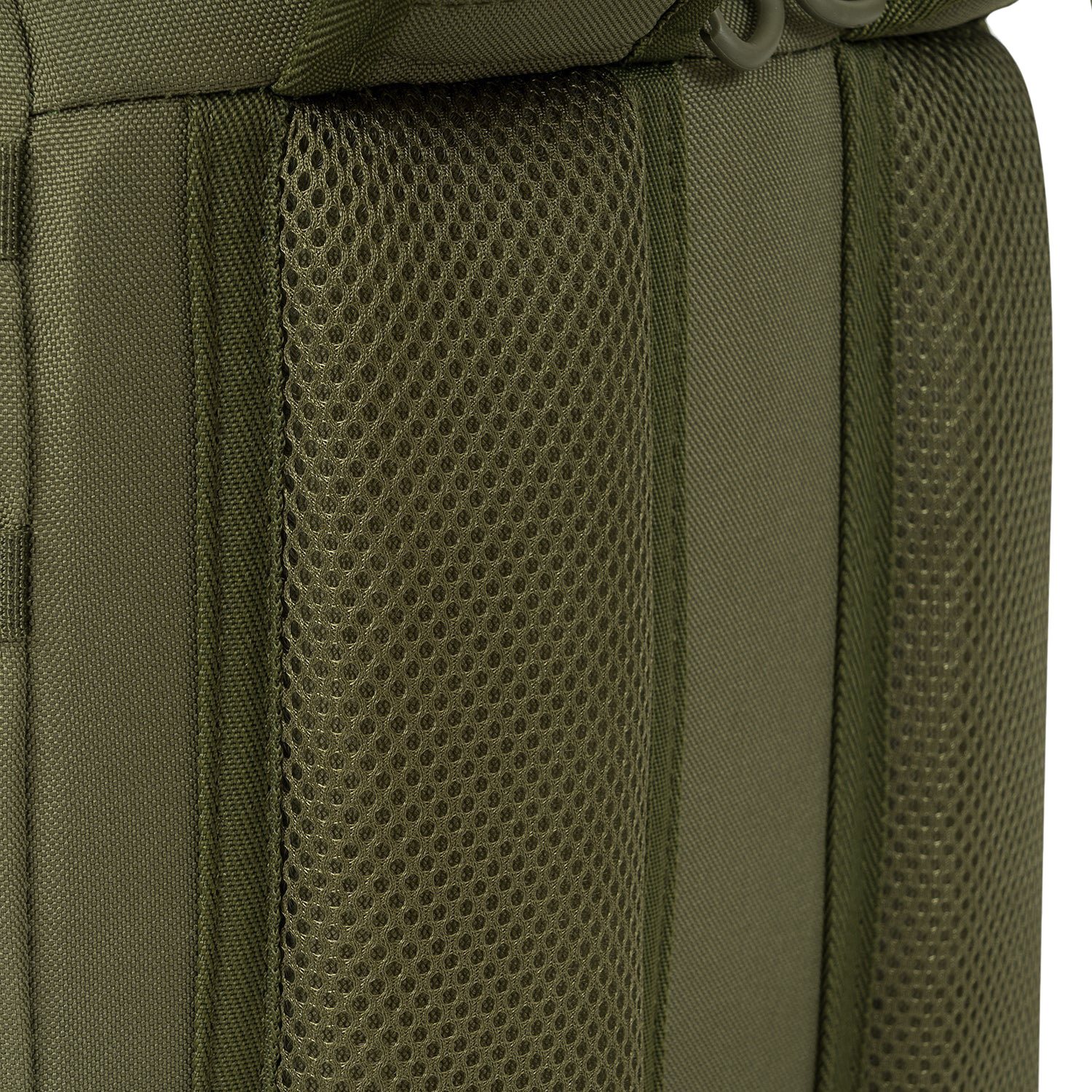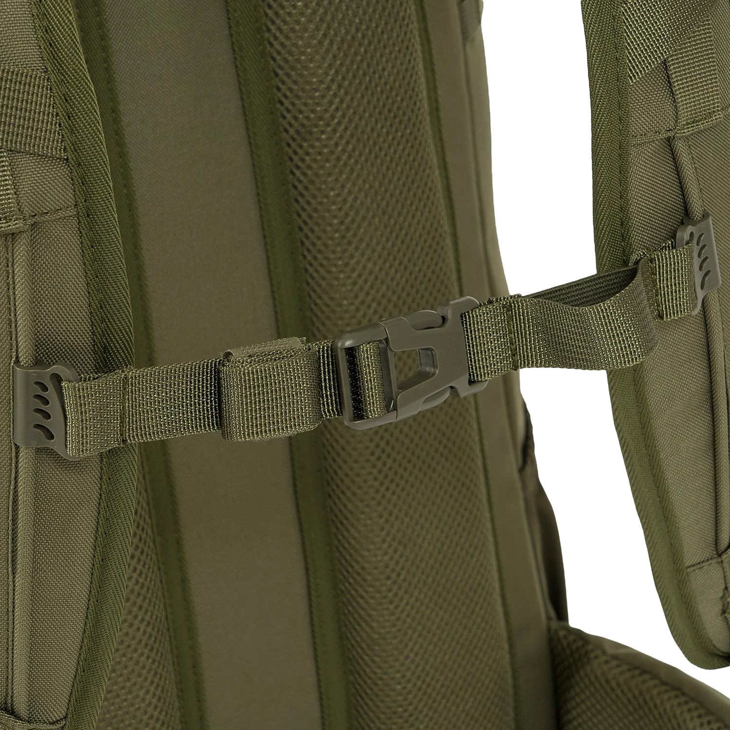La parte posteriore dello zaino è ampiamente imbottita con rete 3D, la cui forma mantiene un canale centrale che migliora la ventilazione. Nella parte superiore dello schienale è presente una classica maniglia in tessuto per il trasporto. Gli spallacci sono completamente regolabili, imbottiti, dotati di cinghie stabilizzatrici, triangoli in plastica, passanti per il tubo della sacca idratante e cinturino pettorale elastico regolabile in altezza, chiuso da una fibbia in plastica. Il giogo dello zaino è parzialmente imbottito, chiuso con una fibbia in plastica e dotato su entrambi i lati di piccole tasche con chiusura a zip. Ai lati dello zaino si trovano tre file di attacchi MOLLE/PALS ridotti e tasche elastiche. Lo sportello principale dello zaino è dotato di una striscia di attacchi MOLLE/PALS, un ampio scomparto centrale, una tasca superiore e un piccolo pannello in VELCRO.