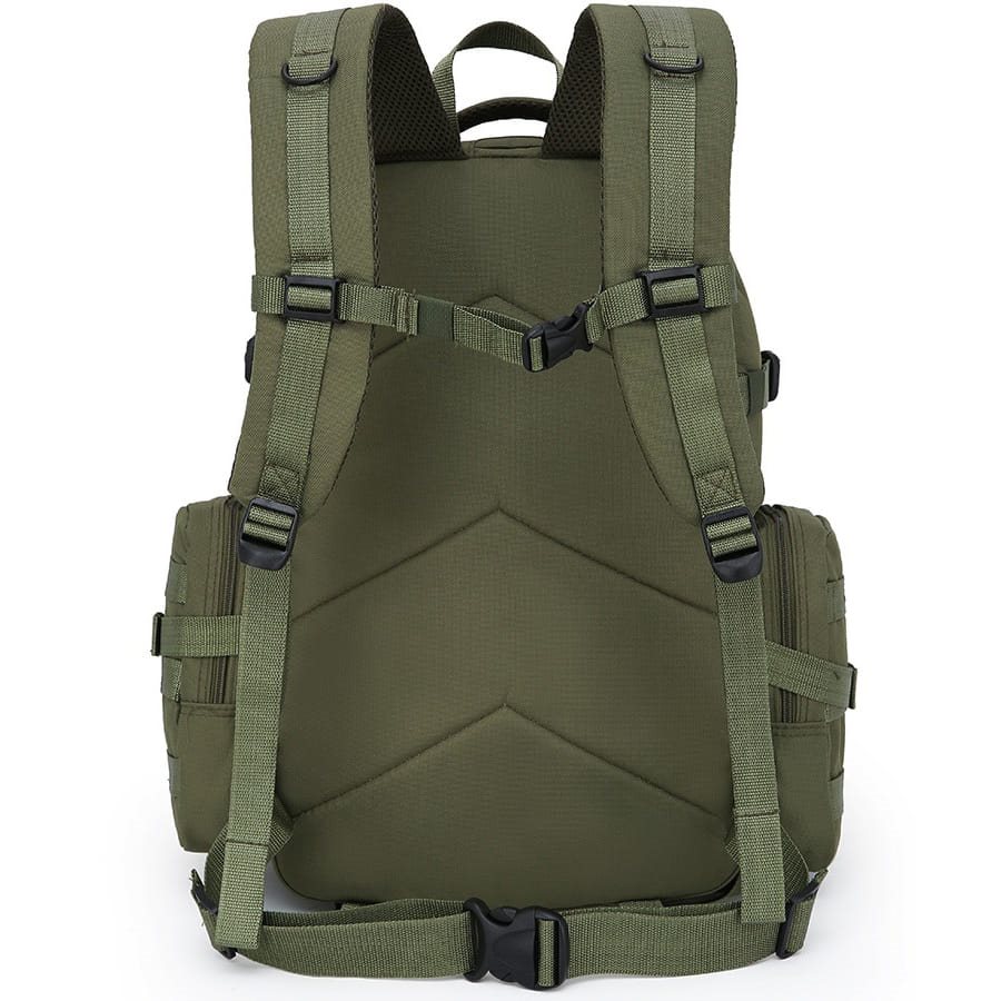 Gli spallacci regolabili sono leggermente curvi, ben imbottiti, dotati di anelli a D in plastica e di una cinghia pettorale regolabile in altezza con fibbia in plastica. La parte posteriore è imbottita con morbida schiuma e nella parte superiore è presente una comoda maniglia per il trasporto. Il cinturone è regolabile in larghezza, costituito da una semplice cinghia e chiuso con una fibbia in plastica. I fianchi sono dotati di due cinghie di compressione e tasche con cerniera che possono contenere anche una borraccia americana da un litro. Queste tasche sono inoltre ricoperte da un sistema di aggancio modulare standard MOLLE/PALS, che consente di fissare ulteriori accessori compatibili come marsupi, custodie, ecc. La parte anteriore dello zaino è divisa in tre tasche separate accessibili tramite cerniere a doppio cursore. Anche qui troverete una chiusura modulare, che nella parte superiore è completata da una striscia di velcro destinata alle vostre etichette VELCRO e alle toppe di identificazione. Lo scomparto principale si apre con una cerniera a doppio cursore e contiene diverse tasche per organizzare facilmente l'attrezzatura e uno scomparto elastico per tablet o laptop di piccole dimensioni.