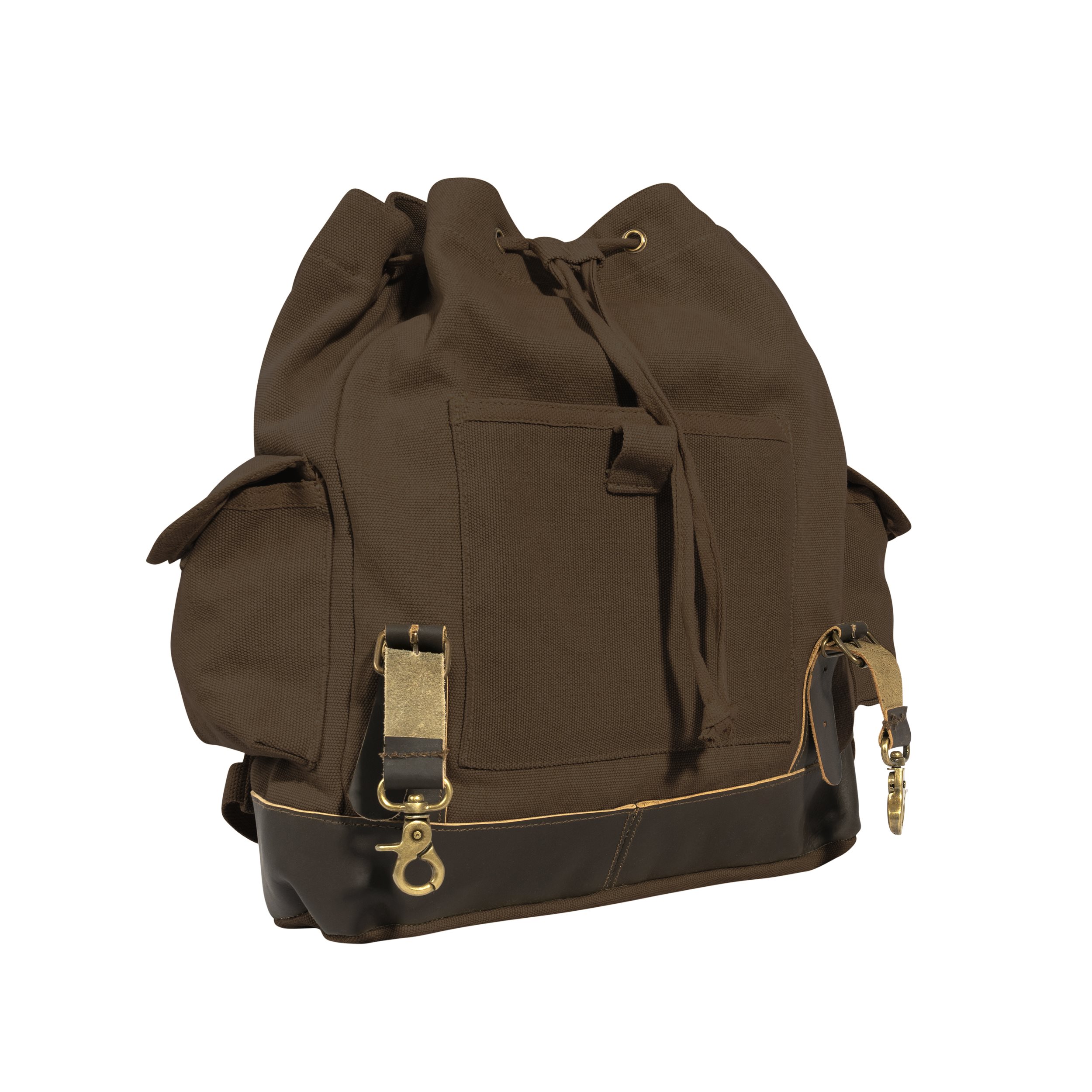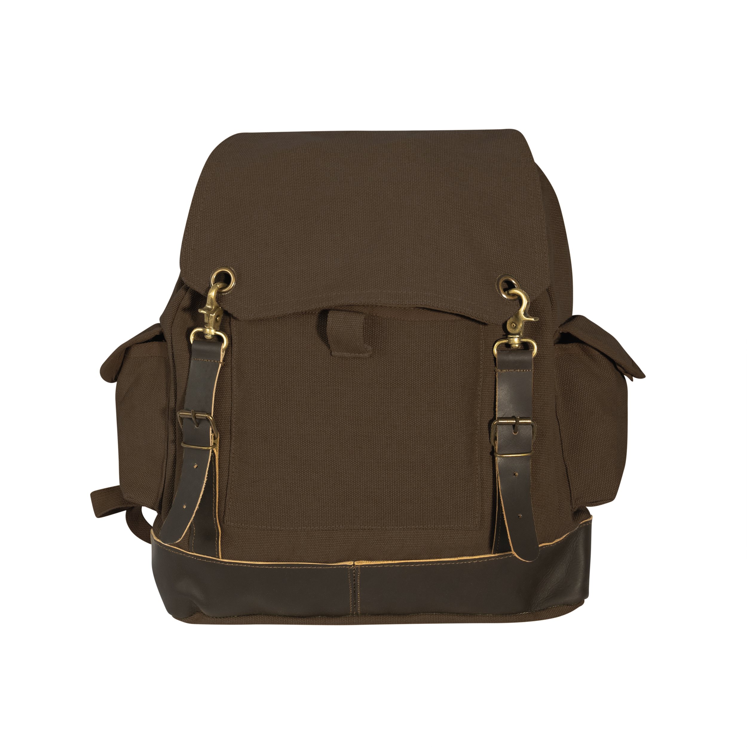 Classico zaino di piccole dimensioni realizzato in robusto cotone canvas in stile vintage, impreziosito da dettagli in pelle e ottone. Un accessorio elegante e pratico per ogni escursionista che si rispetti.