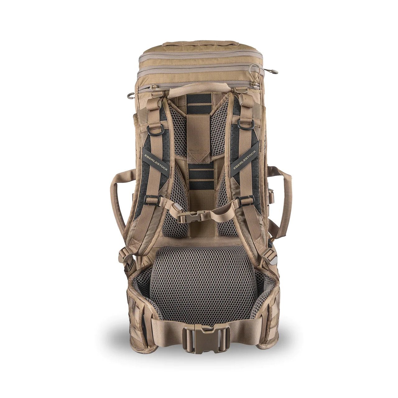 Il sistema di trasporto dello zaino è, come di consueto per Eberlestock, regolabile in altezza e molto sofisticato. Le cinghie di trasporto sono leggermente curve anatomicamente, riccamente imbottite, dotate di cinghie di stabilizzazione, anelli a D in plastica, passanti per il tubo della sacca idratante e, naturalmente, regolabili in altezza. La cinghia pettorale è regolabile in altezza, elastica e si chiude con una fibbia in plastica. La cintura ventrale è fissata con velcro a un cuscino ben imbottito, dispone di due file di attacchi modulari standard MOLLE/PALS e si chiude con una robusta fibbia in plastica. Per trasportare lo zaino sono disponibili una maniglia superiore e due maniglie laterali. Sopra la maniglia superiore sono presenti tre passanti per l'antenna della radio, coperti da una cerniera.