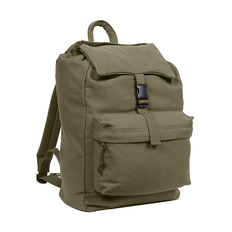 Zaino di dimensioni ridotte realizzato in robusto tessuto di cotone con trattamento idrorepellente, ideale per brevi escursioni di un giorno.
