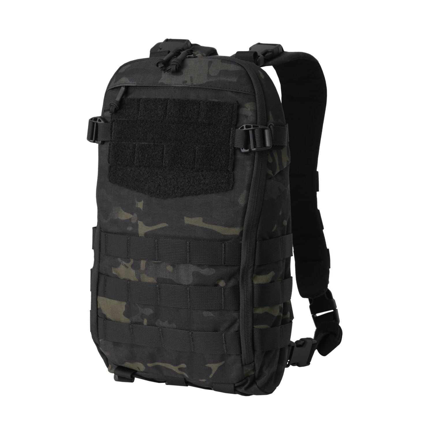 Gli spallacci sono anatomicamente curvi, fortemente imbottiti, dotati di strisce MOLLE e possono essere completamente staccati e non utilizzati per l'integrazione con il gilet tattico o il chest rig. I lati e la parte anteriore dello zaino sono dotati di un'ulteriore chiusura modulare MOLLE/PALS, quindi non è un problema aggiungere allo zaino ulteriori accessori compatibili. Per posizionare etichette o toppe con chiusura in velcro è disponibile un pannello molto ampio con chiusura in velcro combinato con una chiusura modulare. Ai lati si trovano cinghie di compressione con gancio a G. Il fondo dello zaino è dotato di un elastico con un piccolo fermo in plastica. Questo elastico è ideale per riporre una giacca a vento sottile o attrezzature di dimensioni simili. La tasca frontale è piatta e destinata alla conservazione di documenti. Lo scomparto principale è accessibile tramite una cerniera a doppio cursore con tiretti. All'interno è presente uno scomparto per riporre la sacca idrica, il cui tubo può essere fatto uscire dalla parte superiore destra o sinistra dello zaino. La sacca è fissata con una piccola fibbia in plastica.