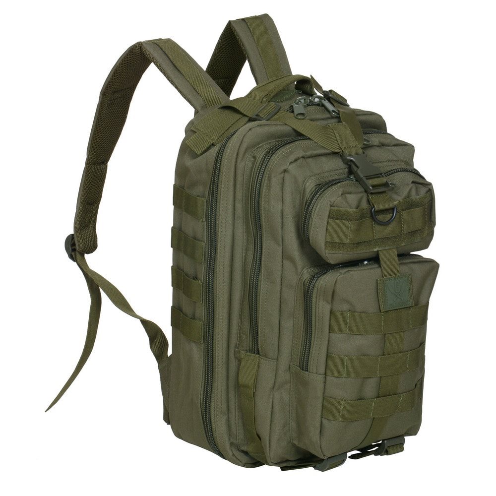 Zaino tattico di dimensioni ridotte, ideale per l'uso quotidiano, la cui struttura si ispira ai classici zaini da combattimento. È realizzato in poliestere resistente con rivestimento idrorepellente.