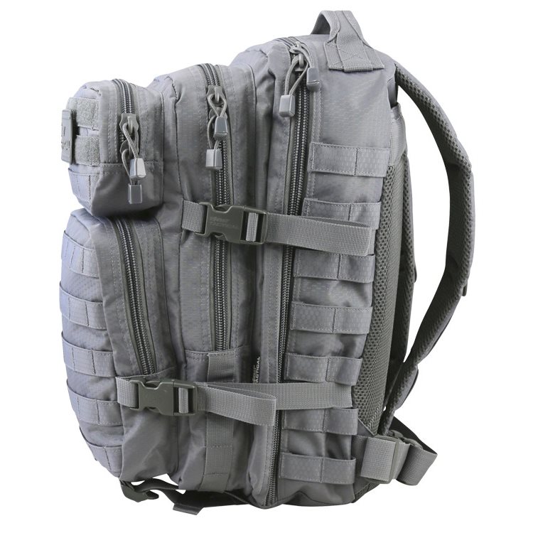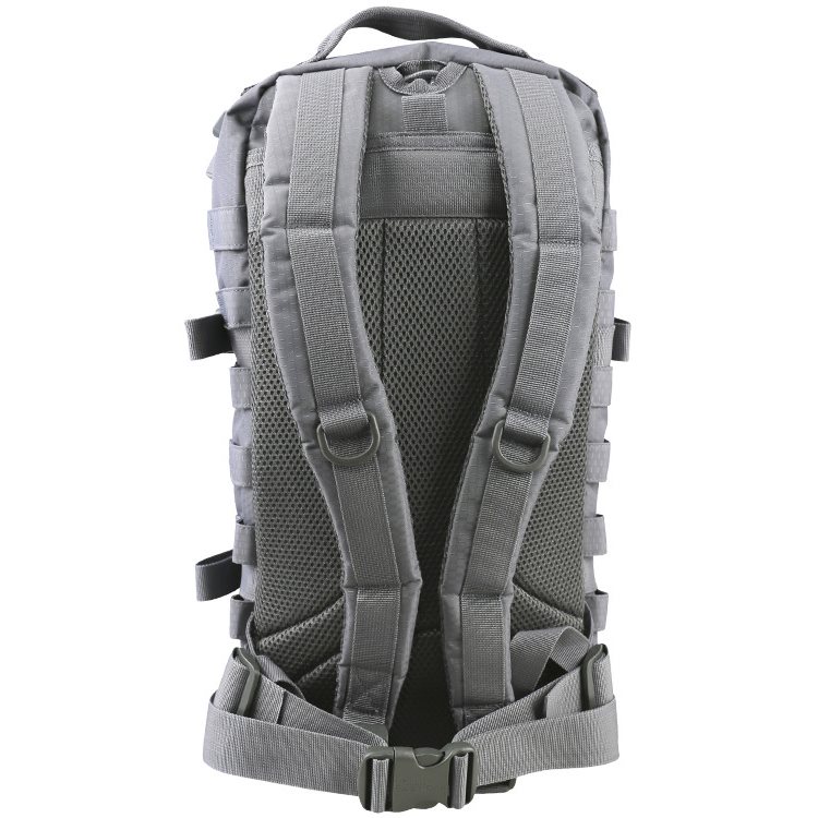 Gli spallacci dello zaino sono anatomicamente curvi, regolabili in altezza, ampiamente imbottiti con rete 3D e dotati di anelli a D in plastica. Il cinturone dello zaino è costituito da una semplice cinghia, chiusa con una fibbia FASTEX in plastica e regolabile in lunghezza. Sono anch'essi imbottiti e contengono uno scomparto per la sacca idrica. Ai lati dello zaino è presente un sistema di aggancio MOLLE/PALS, ideale per fissare ulteriori accessori compatibili. Oltre al sistema di aggancio sui lati, sono presenti anche due cinghie di compressione chiuse con fibbia in plastica.