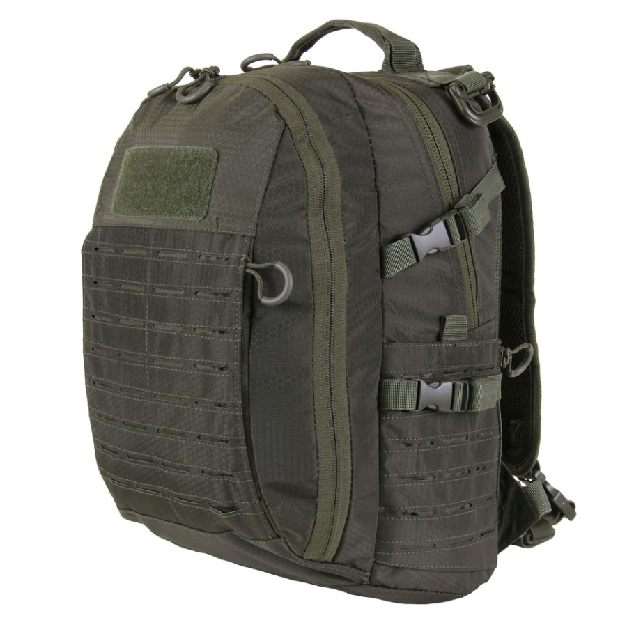 Zaino tattico in tessuto ripstop di nylon con un motivo esagonale non convenzionale.