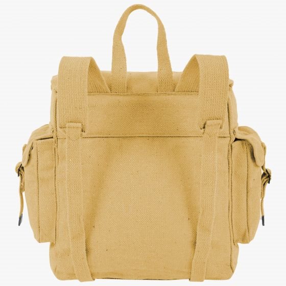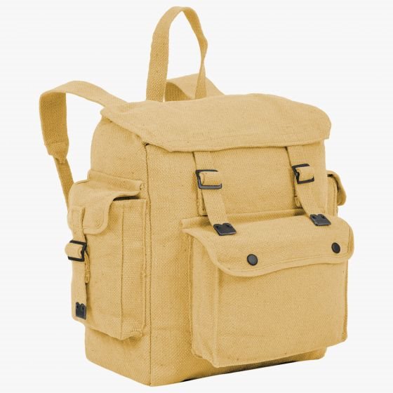 Zaino con ampio scomparto principale, due tasche laterali e un'ulteriore tasca frontale con chiusura a scatto. Lo zaino è realizzato in tela resistente (cotone). Dimensioni: 325 x 350 x 145 mm. Ulteriori informazioni