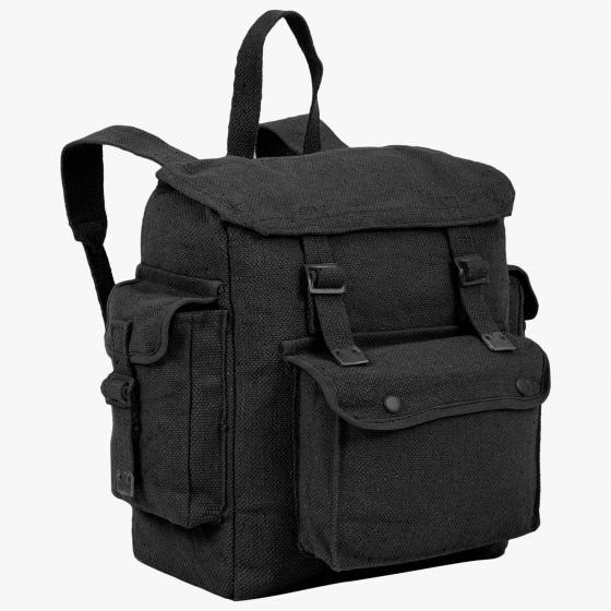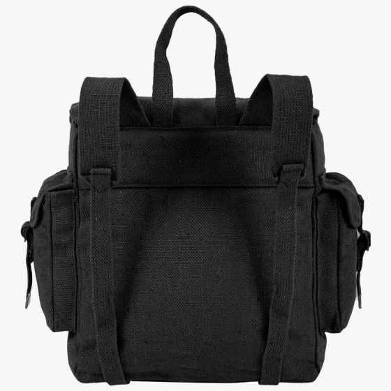 Zaino con ampio scomparto principale, due tasche laterali e un'ulteriore tasca frontale con chiusura a scatto. Lo zaino è realizzato in tela resistente (cotone). Dimensioni: 325 x 350 x 145 mm. Ulteriori informazioni