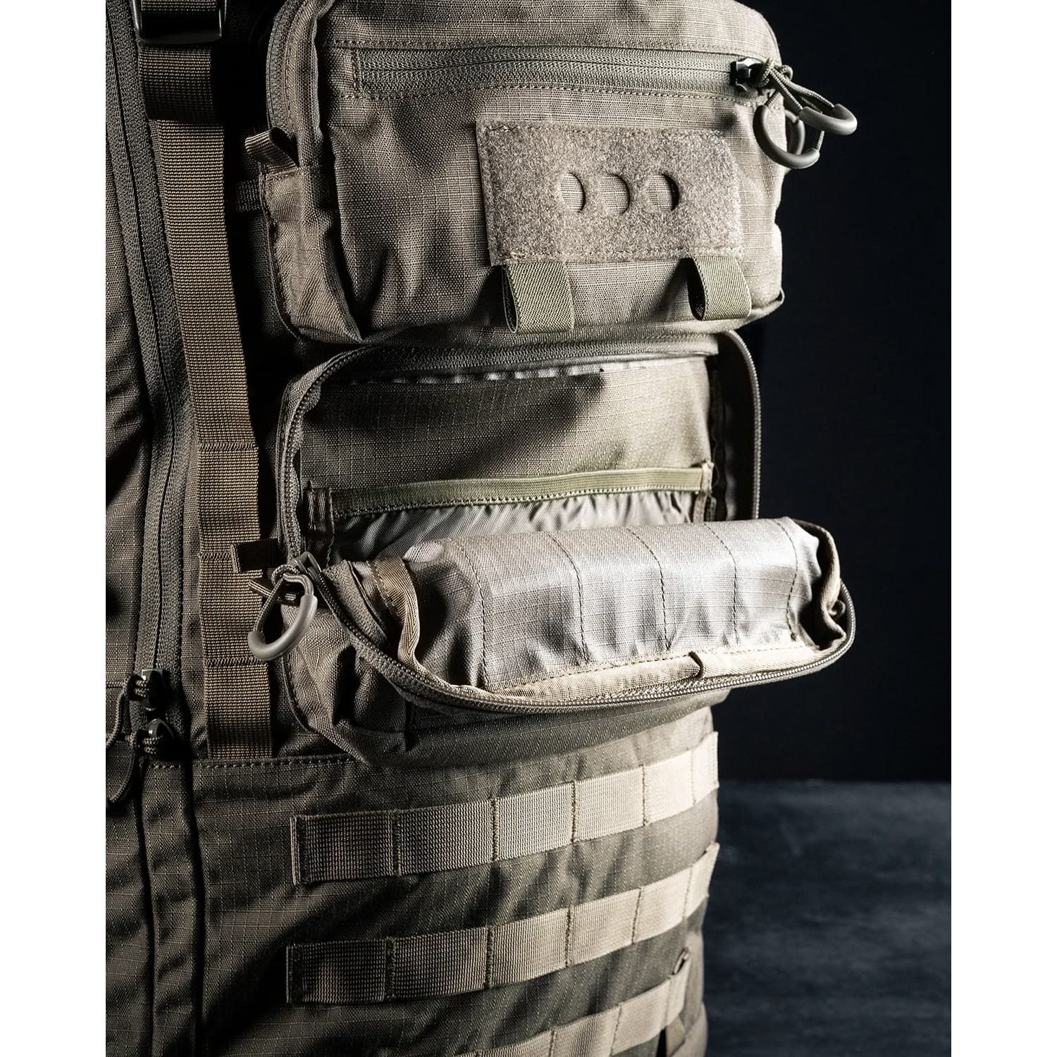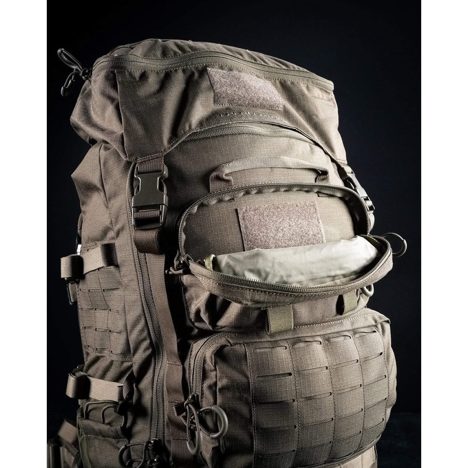 Per una facile organizzazione, lo zaino è dotato, sul lato esterno, di una coppia di tasche frontali accessibili tramite cerniere a doppio cursore e di una coppia di tasche laterali in materiale parzialmente elastico. È possibile utilizzare un totale di quattro cinghie laterali regolabili per una compressione rapida e semplice dello zaino. L'interno dello scomparto principale è accessibile tramite l'apertura frontale o tramite il lembo arrotolabile superiore chiuso da una fibbia Fastex. Lo scomparto principale è diviso in due parti da un divisorio interno; all'interno troverete un passante per il posizionamento della sacca idrica e un pannello con attacchi modulari intagliati al laser per il fissaggio, ad esempio, di una radio.