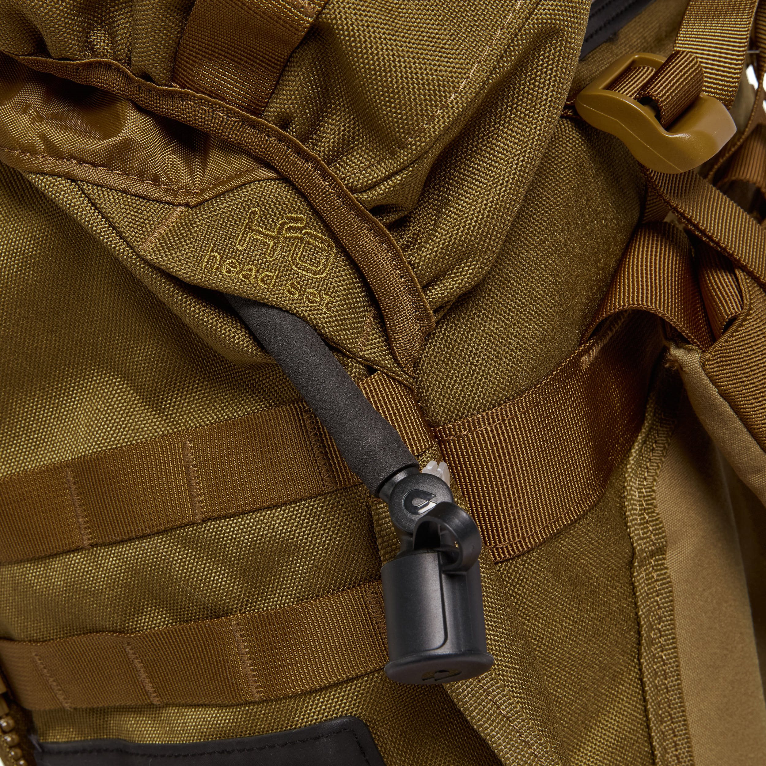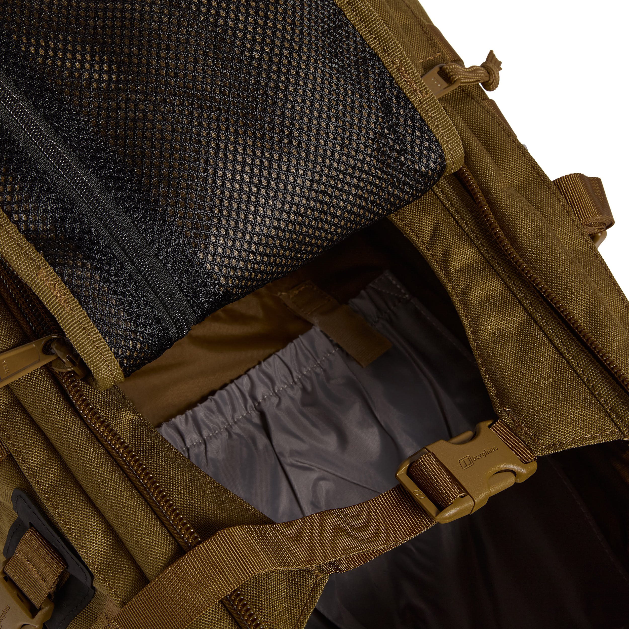 Sulla parte anteriore è presente una patta cucita con chiusura modulare, che dispone anche di uno scomparto nascosto con tasca in tessuto. Questo permette di fissare al zaino un casco o attrezzature di dimensioni simili. La parte posteriore della patta è dotata di un piccolo scomparto in rete. Il coperchio superiore è fissato con fibbie fastex in plastica e presenta una chiusura in velcro per le vostre toppe VELCRO, due strisce di cucitura modulare e una tasca più piccola accessibile tramite cerniera. All'interno della tasca principale si trova uno scomparto per la sacca idrica, diversi occhielli in tessuto per fissare eventuali attrezzature più pesanti e due cinghie di sicurezza chiuse con fibbie in plastica. Il fondo dello zaino è dotato di una tasca per riporre l'impermeabile, che non è incluso nella confezione dello zaino.