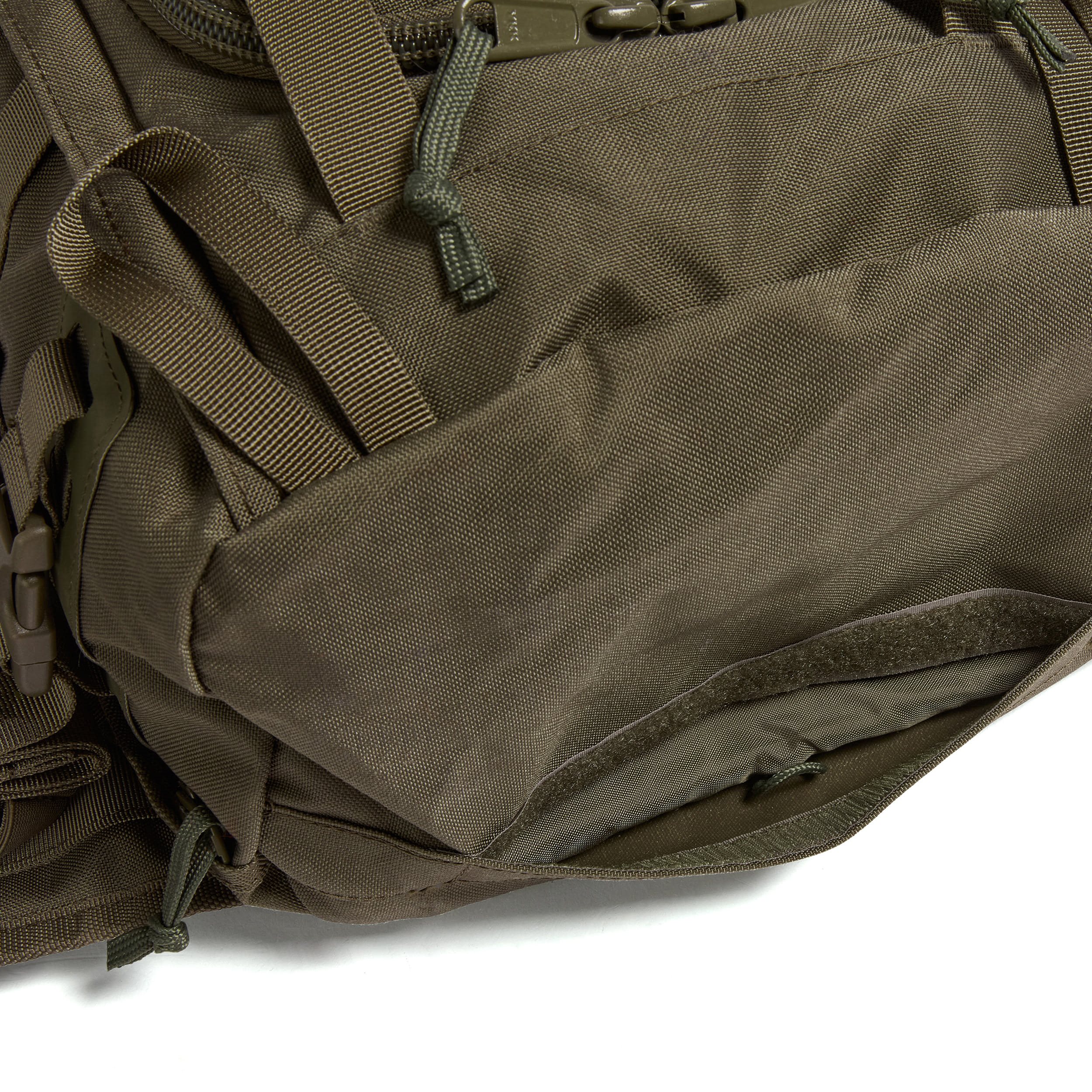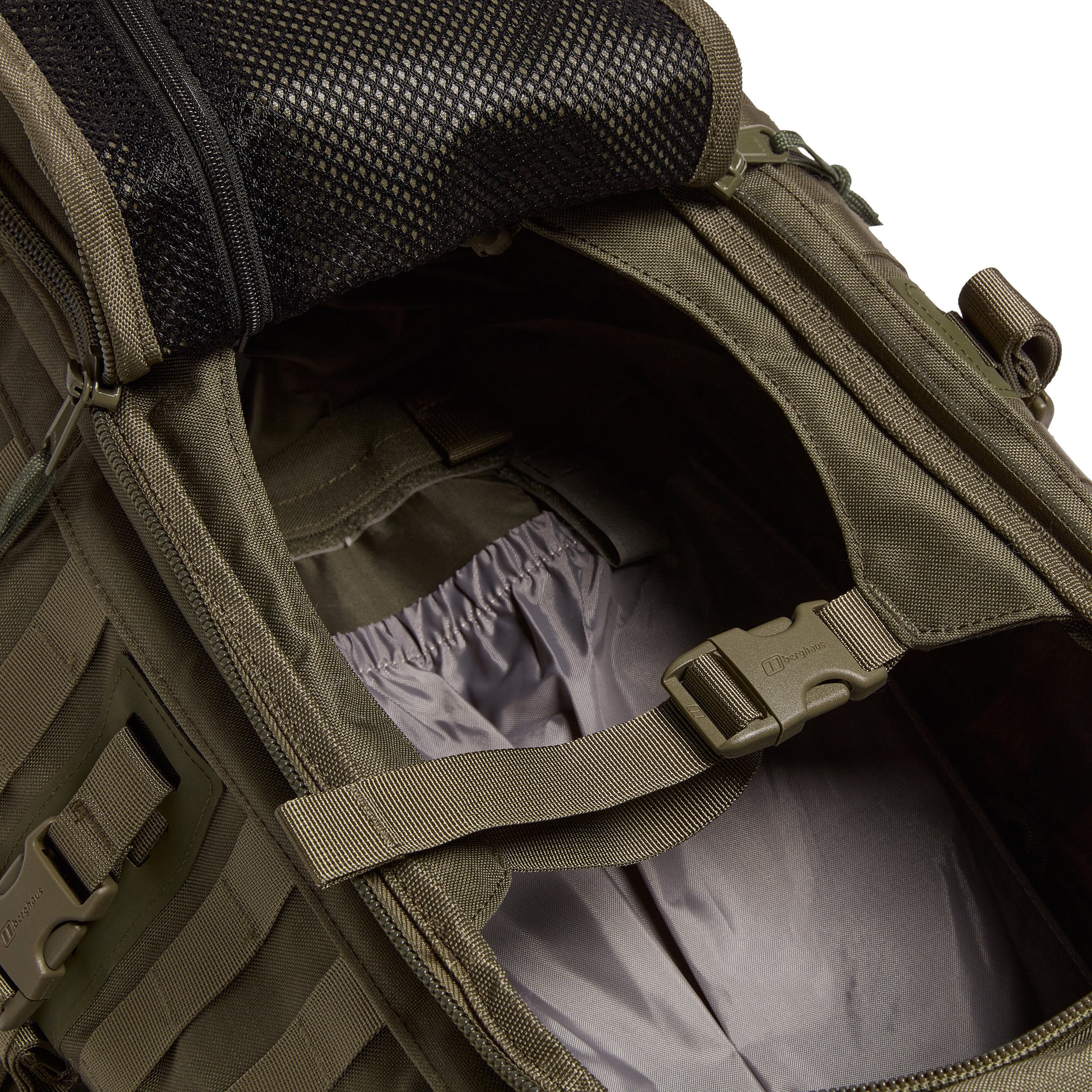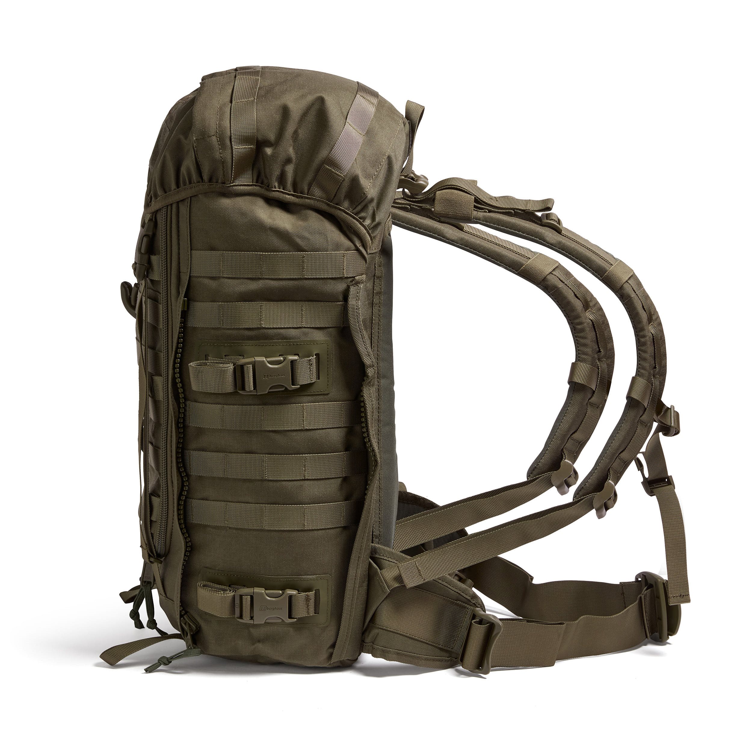 Si tratta della quarta evoluzione dello zaino militare CENTURIO del rinomato produttore britannico BERGHAUS. Lo zaino è realizzato in resistente materiale Cordura 1100D, dotato di protezione contro le radiazioni nello spettro IR, conforme alle norme per l'uso da parte della Bundeswehr (secondo lo standard TL 8305-0278) e progettato per resistere a un uso quotidiano intensivo in condizioni estreme. Per riempire l'interno sono disponibili due aperture, una superiore e una frontale.