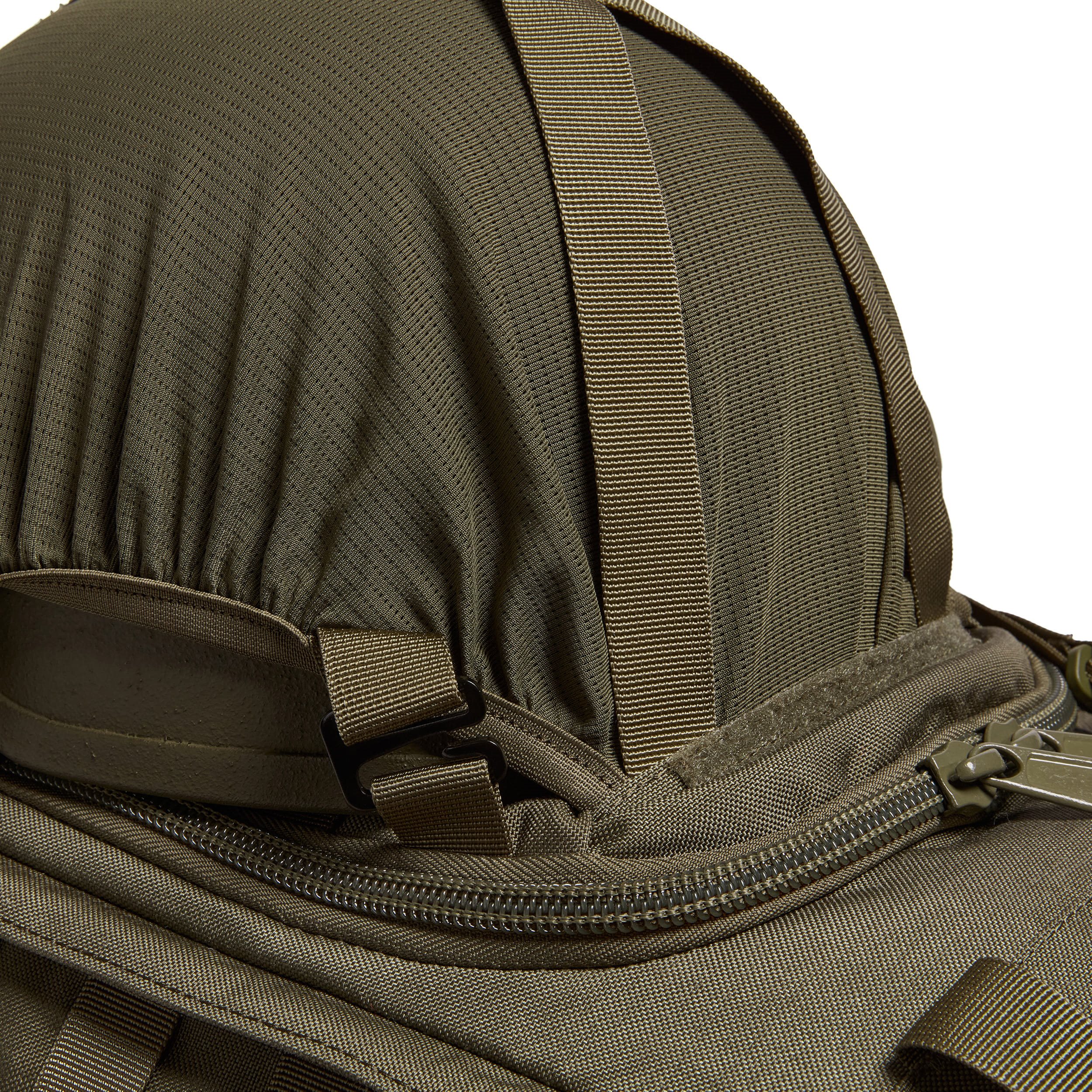 Sulla parte anteriore è presente una patta cucita con chiusura modulare, che dispone anche di uno scomparto nascosto con tasca in tessuto. Questo permette di fissare al zaino un casco o attrezzature di dimensioni simili. La parte posteriore della patta è dotata di un piccolo scomparto in rete. Il coperchio superiore è fissato con fibbie Fastex in plastica e presenta una chiusura in velcro per le vostre toppe VELCRO, due strisce di cucitura modulare e una tasca più piccola accessibile tramite cerniera. All'interno della tasca principale si trova uno scomparto per la sacca idrica, diversi occhielli in tessuto per fissare eventuali attrezzature più pesanti e due cinghie di sicurezza chiuse con fibbie in plastica. Il fondo dello zaino è dotato di una tasca destinata a contenere un impermeabile, che non è incluso nella confezione dello zaino.