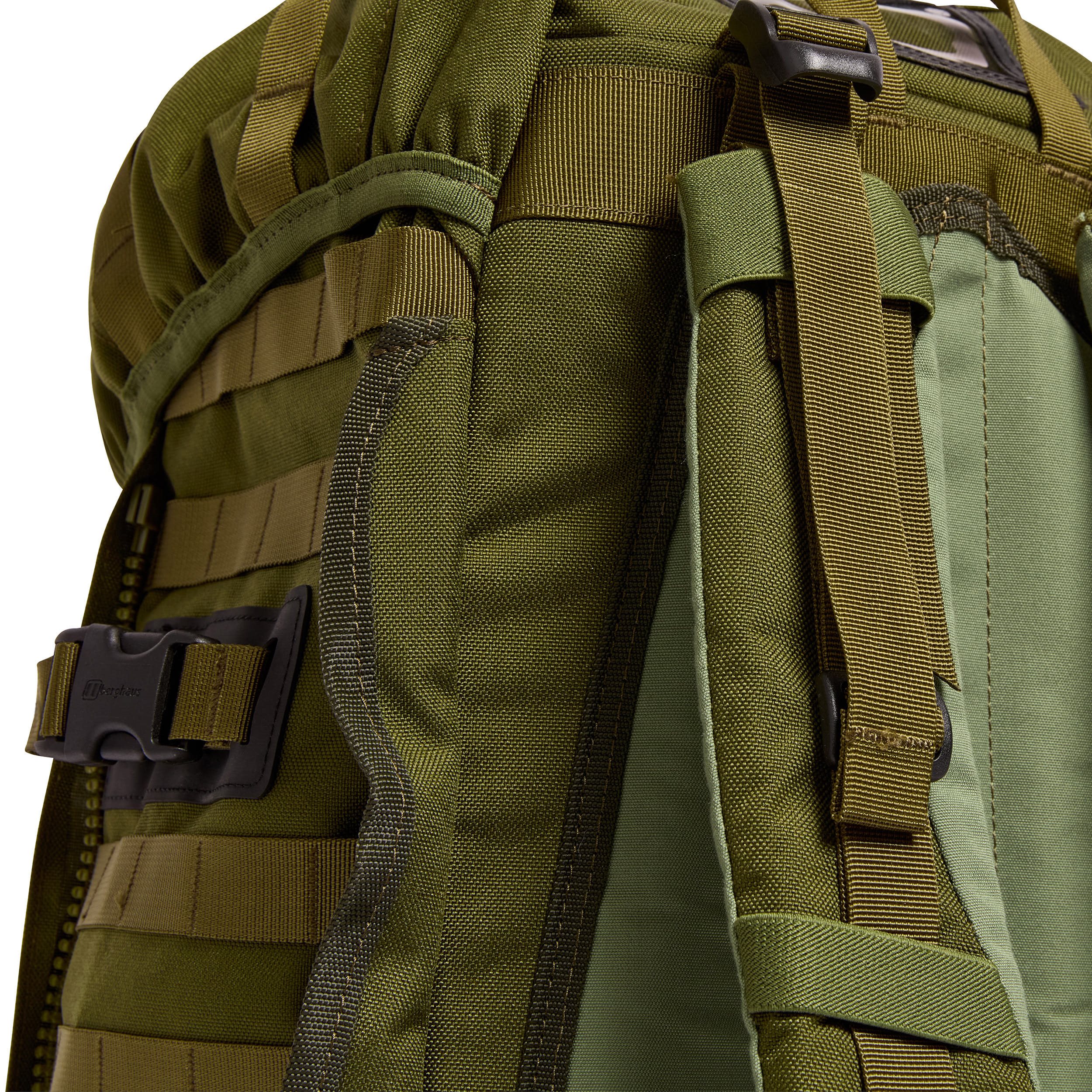 Gli spallacci sono fortemente imbottiti, regolabili in altezza, anatomicamente curvi, dotati di cinghie stabilizzatrici, passanti per il tubo della sacca idratante e cinturino pettorale elastico, regolabile in altezza in tre posizioni. Il cinturone è leggermente imbottito nella parte stretta dello zaino e si chiude con una fibbia in plastica Bergbuckle. La parte posteriore è rinforzata da una resistente struttura in alluminio e imbottita con schiuma. Sopra le cinghie si trova una semplice maniglia per il trasporto e una finestrella in mica per le targhette identificative. Ai lati sono presenti aperture per il passaggio del tubo della sacca idrica, diverse file di attacchi modulari standard MOLLE/PALS e due coppie di cinghie di compressione per fissare attrezzature aggiuntive. Se necessario, è possibile utilizzare le cerniere laterali per fissare attrezzature compatibili della linea MMPS.