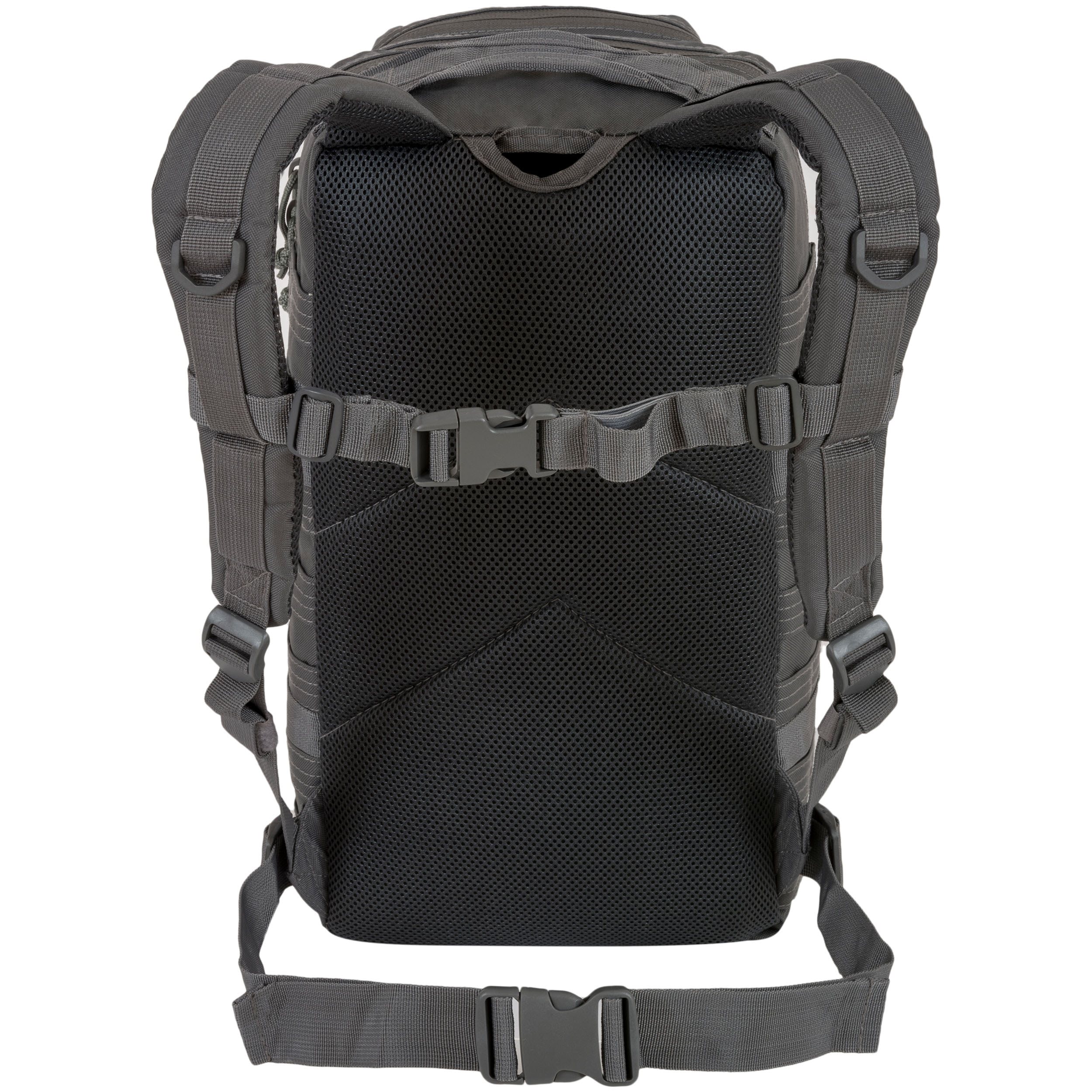 Gli spallacci dello zaino sono anatomicamente curvi, regolabili in altezza, dotati di passanti in plastica e piacevolmente imbottiti con rete 3D. La cinghia pettorale è elastica e si chiude con una fibbia in plastica. La parte posteriore dello zaino è ampiamente imbottita. Nella parte superiore dello zaino è presente una maniglia di trasporto resistente. Ai lati è presente un sistema di aggancio modulare MOLLE/PALS completato da cinghie di compressione con fibbie in plastica. Nella parte anteriore dello zaino sono presenti due tasche sfalsate. La tasca frontale inferiore è dotata di un altro sistema di aggancio modulare MOLLE/PALS, mentre la tasca superiore è rivestita con un pannello in velcro per le vostre toppe VELCRO. Entrambe le camere principali dello zaino sono accessibili tramite cerniere a doppio cursore con manopole prominenti e contengono diversi pratici scomparti per organizzare facilmente l'attrezzatura trasportata.