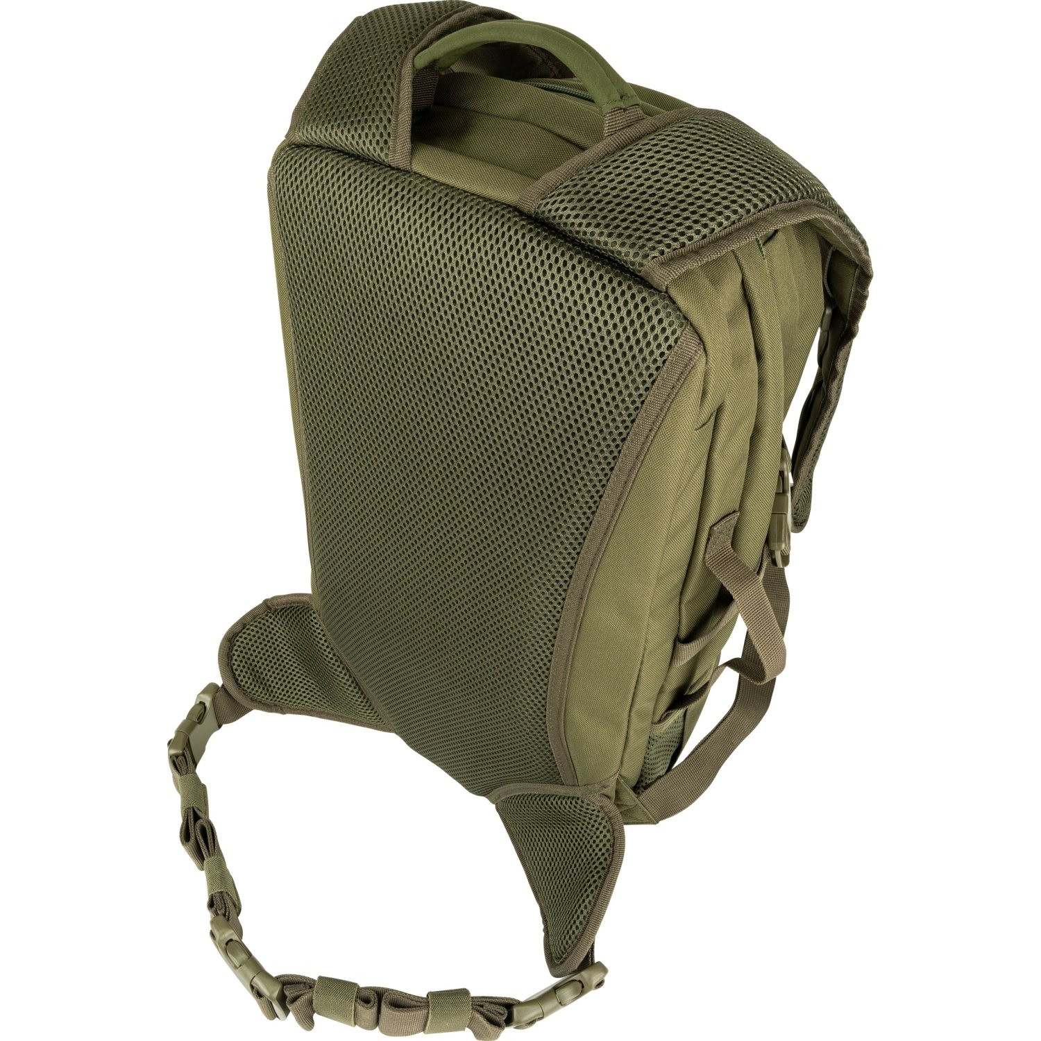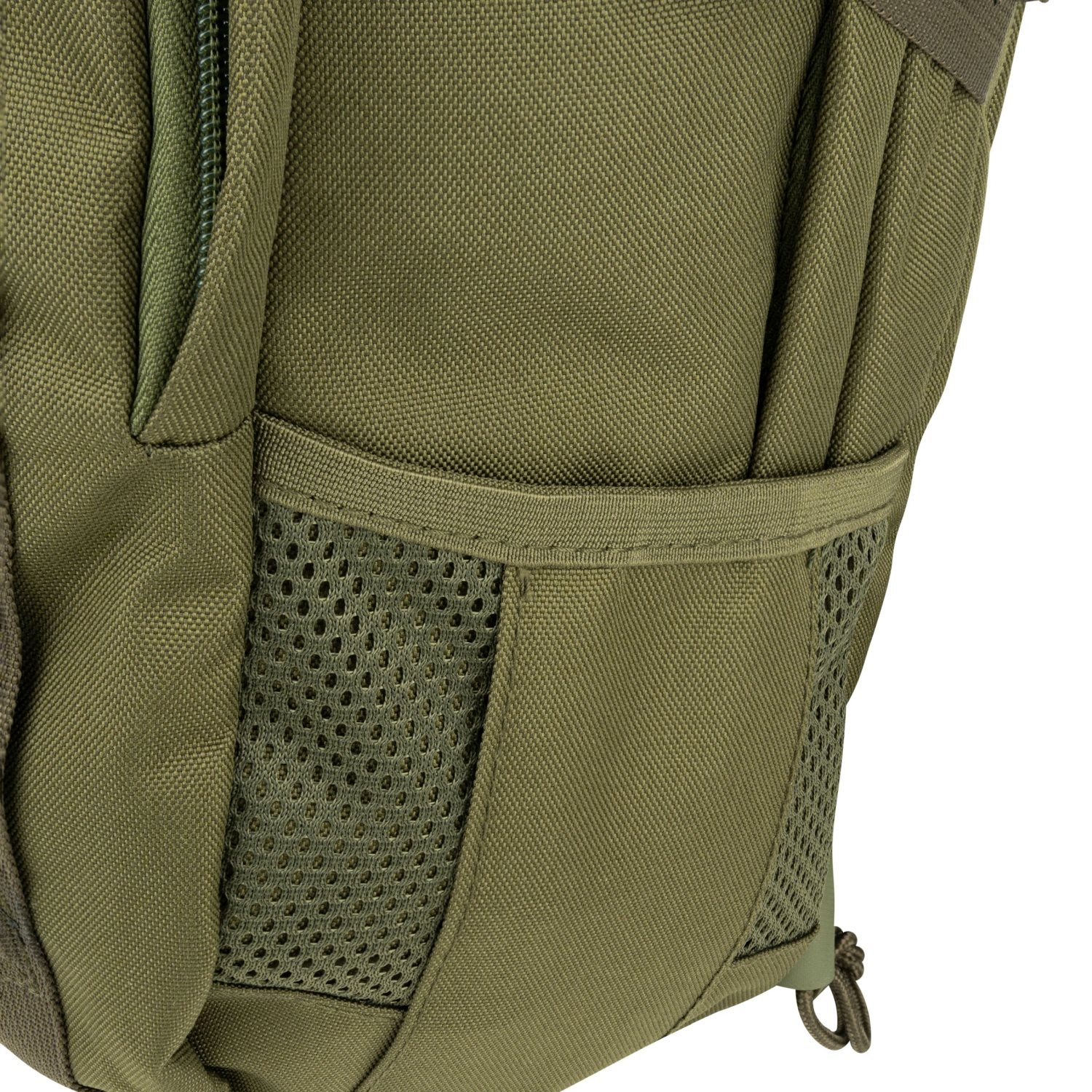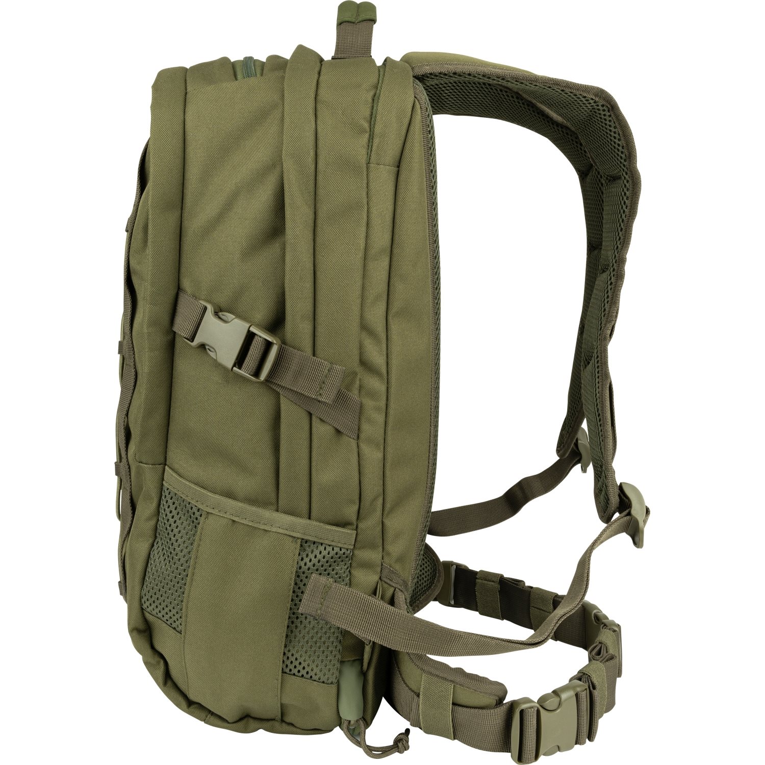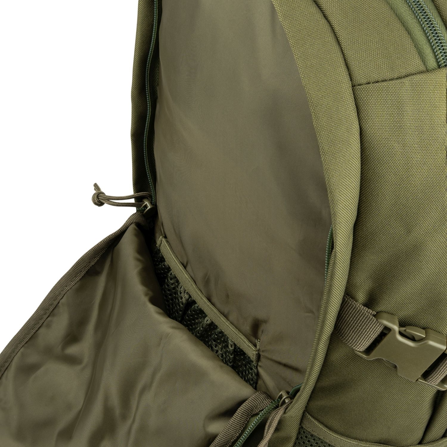 Gli spallacci dello zaino sono anatomici, regolabili in lunghezza, imbottiti con rete 3D e dotati di cinturino pettorale regolabile in altezza. Il cinturino ventrale è staccabile, regolabile e fissato con fibbia FASTEX in plastica. Lo schienale è ben imbottito e sopra di esso si trova una maniglia per il trasporto. Ai lati dello zaino si trovano due tasche parzialmente in rete destinate al trasporto di borracce e due cinghie di compressione chiuse con fibbia. Sulla parte anteriore dello zaino è presente un cordino elastico a cui è possibile agganciare una giacca a vento o attrezzature simili. Per riporre l'attrezzatura sono disponibili due scomparti chiusi con cerniera a doppio cursore. Lo scomparto anteriore contiene una tasca in rete, mentre quello posteriore è dotato di una piccola tasca con chiusura a zip e di uno scomparto elastico destinato a una sacca idrica o a un tablet. La custodia pieghevole è riposta all'interno dello zaino e può contenere senza problemi la maggior parte delle armi lunghe. Per fissare l'attrezzatura aggiuntiva è possibile utilizzare gli anelli a D in plastica.