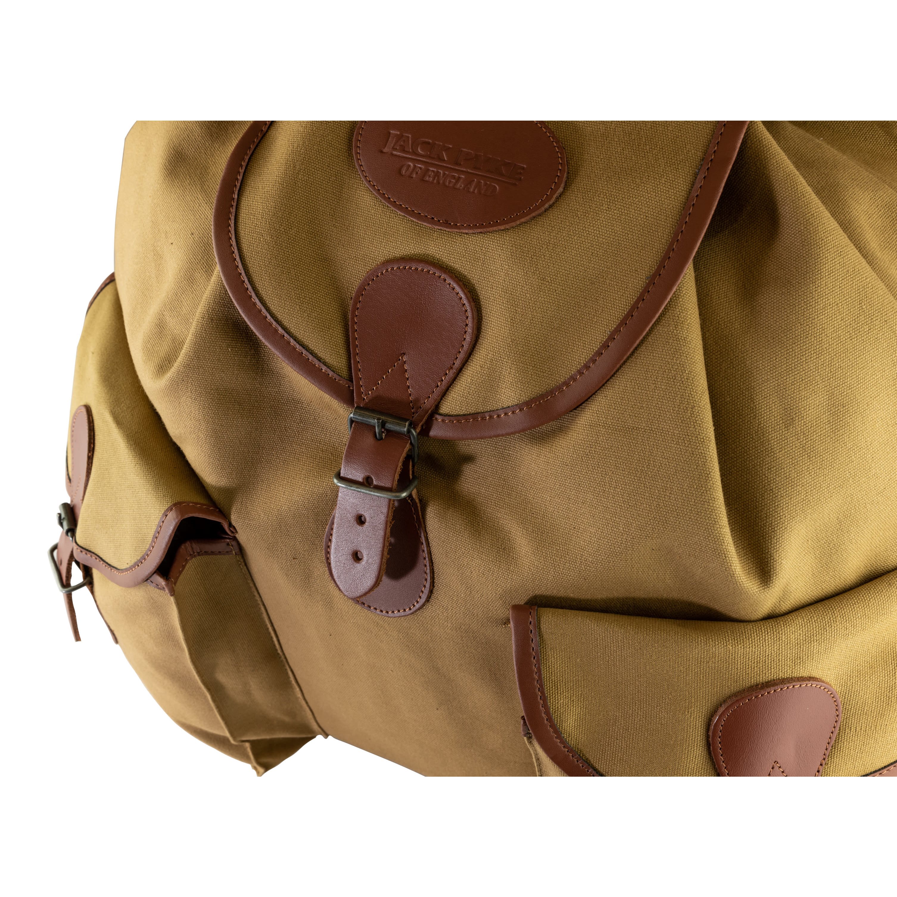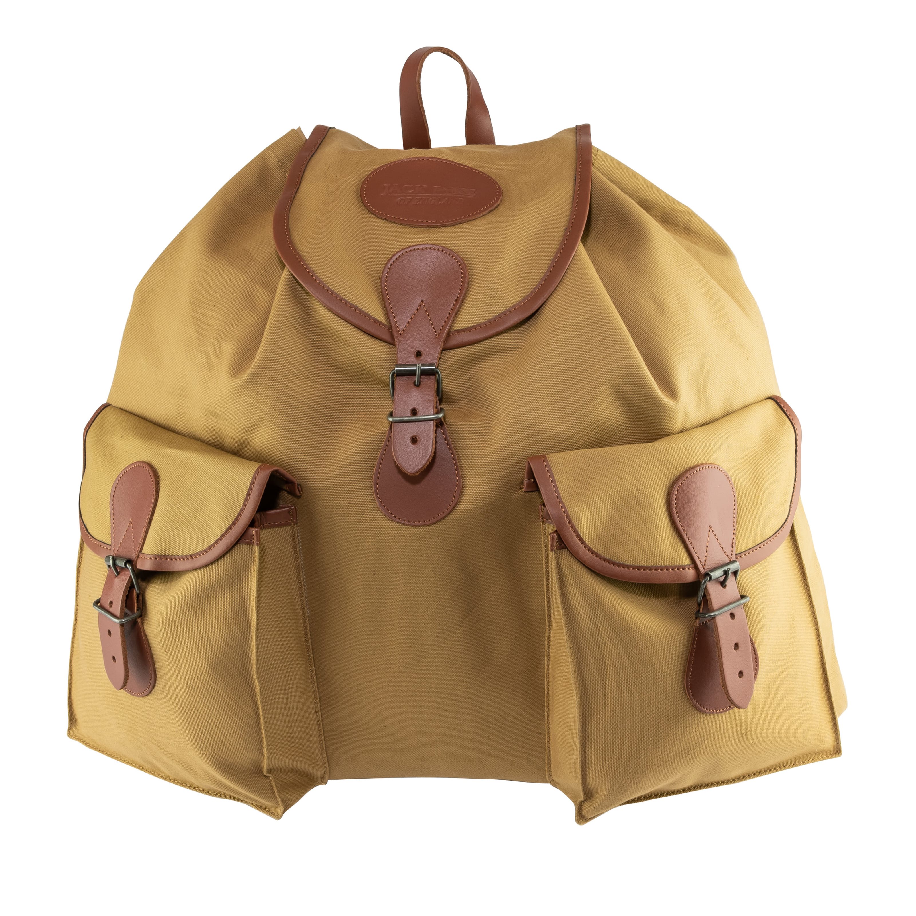 Zaino in tela di grande capienza realizzato in tela di cotone, resistente alle sollecitazioni meccaniche e di facile pulizia. Gli spallacci sono in pelle e regolabili nella parte inferiore tramite una semplice fibbia. La parte superiore dello zaino è dotata di una semplice maniglia per il trasporto. Le due tasche anteriori sfalsate sono ideali per gli oggetti che si desidera avere rapidamente a portata di mano. Le tasche sono coperte da patta con chiusura in pelle. Lo scomparto principale è senza divisori ed è anch'esso accessibile tramite patta.