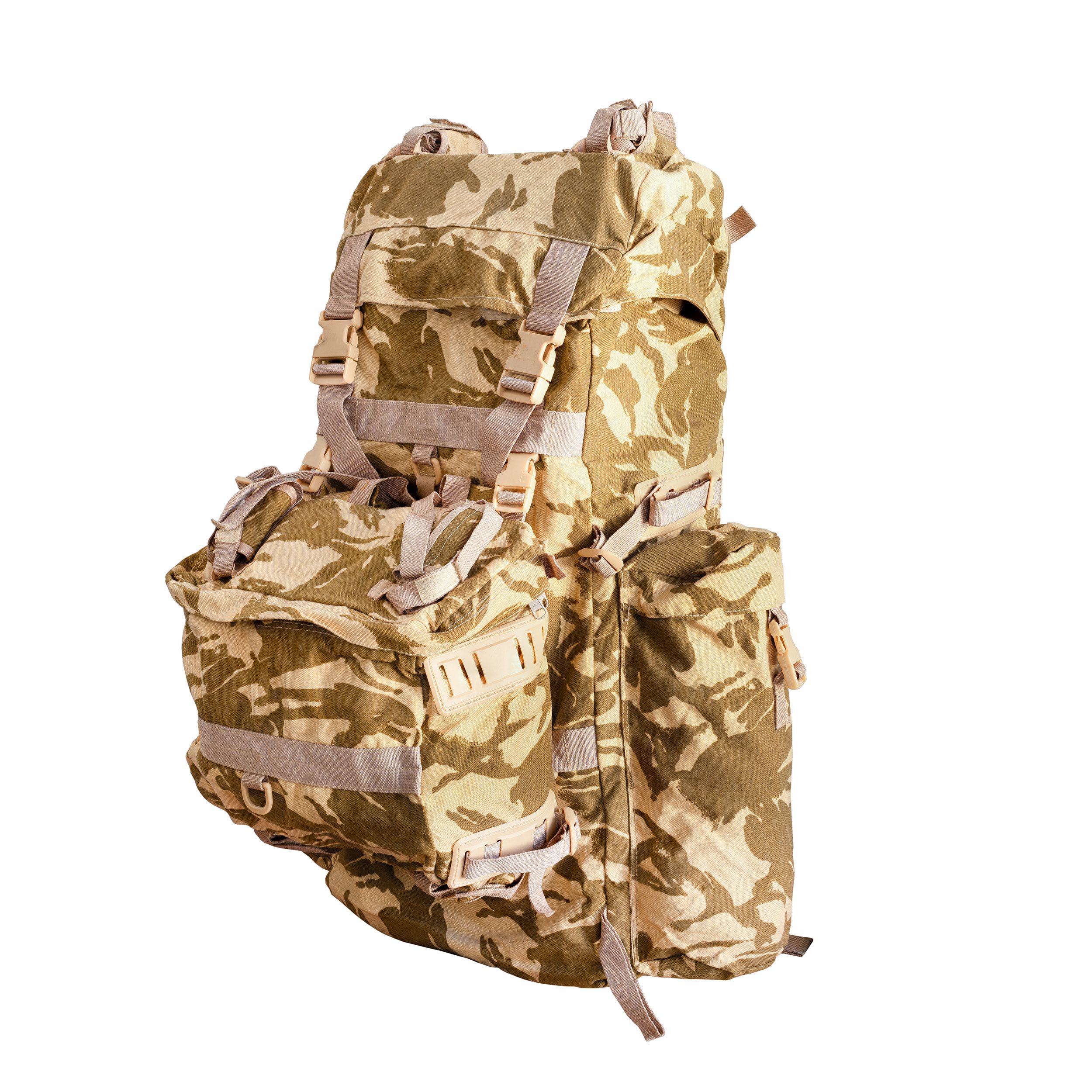 Gli spallacci sono regolabili in altezza e dotati di cinghie stabilizzatrici. Il cinturone è parzialmente imbottito e costituito da una cinghia chiusa da una robusta fibbia in plastica. La parte superiore dello schienale è dotata di un cuscino imbottito e rinforzata da un robusto telaio in plastica rimovibile. Nella parte superiore dello schienale è presente una maniglia di trasporto in tessuto. Le tasche laterali sono relativamente capienti e chiudibili con patta con fibbia in plastica. Nella parte anteriore è presente uno zaino di emergenza staccabile composto da un unico scomparto senza divisori interni e con la possibilità di fissare all'esterno attrezzature aggiuntive tramite cinghie di fissaggio. Il coperchio dello zaino è dotato di una tasca interna piuttosto capiente. Lo scomparto principale è accessibile tramite una patta con chiusura a cordoncino e non presenta alcuna suddivisione interna.