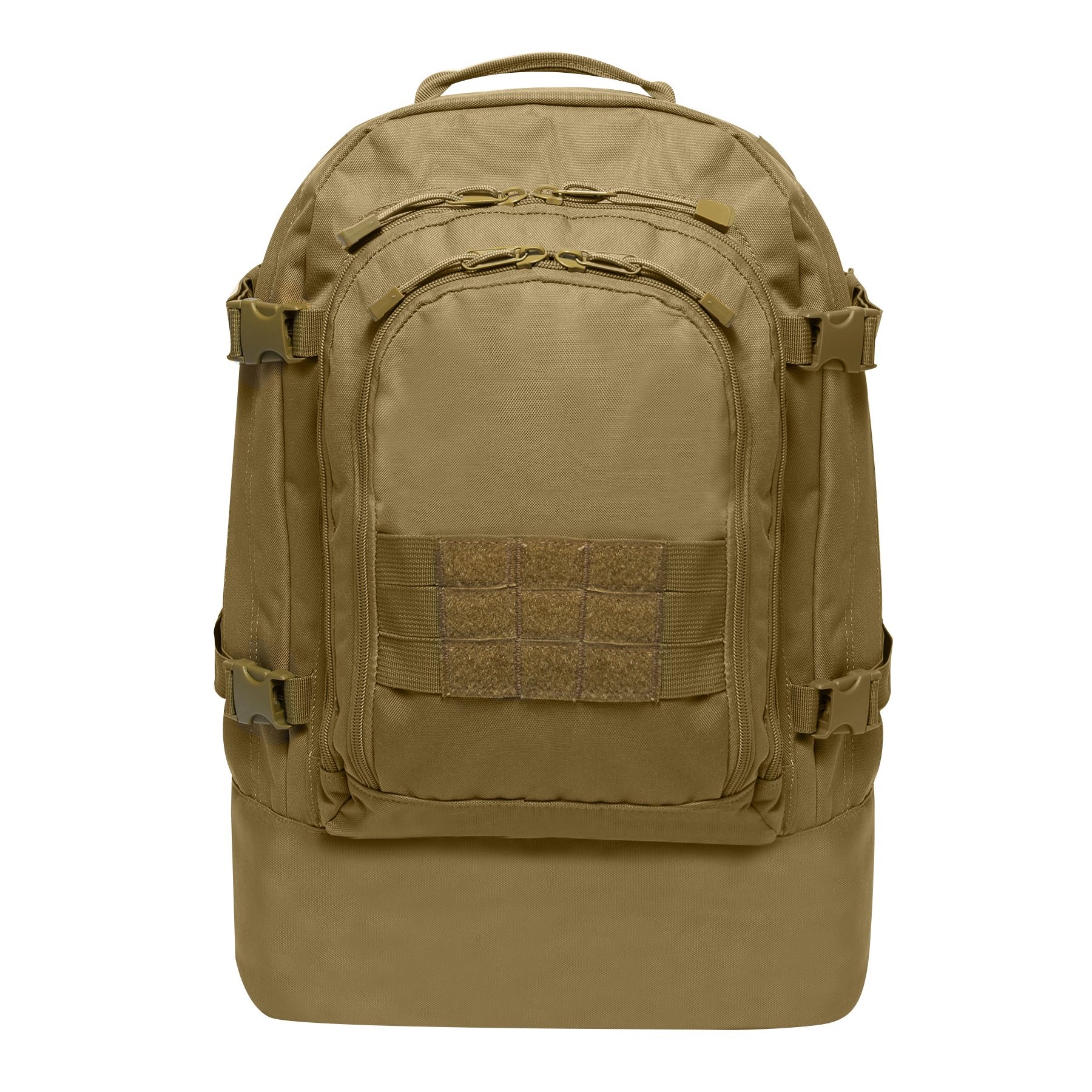 Zaino tattico da tre giorni basato sui collaudati zaini da assalto. Lo zaino offre una struttura a basso profilo con un volume relativamente elevato, apprezzato da escursionisti, avventurieri, addetti alla sicurezza e simili. Lo zaino è dotato di schienale imbottito, spallacci regolabili in base alla taglia, completati da un cinturone imbottito con chiusura fastex. Ai lati sono presenti due cinghie di compressione e un sistema di aggancio MOLLE/PALS per collegare attrezzature compatibili. Sulla parte anteriore dello zaino è presente un sistema di aggancio MOLLE/PALS con velcro per le vostre toppe VELCRO. Lo spazio di stivaggio dello zaino è suddiviso in tre scomparti. Il primo scomparto anteriore dispone di due scomparti e una tasca in rete. Nel secondo scomparto si trova uno scomparto in rete relativamente grande. Lo scomparto principale non è suddiviso, ma è dotato di rivestimento in PVC. Gli scomparti sono accessibili tramite cerniere a doppio cursore.