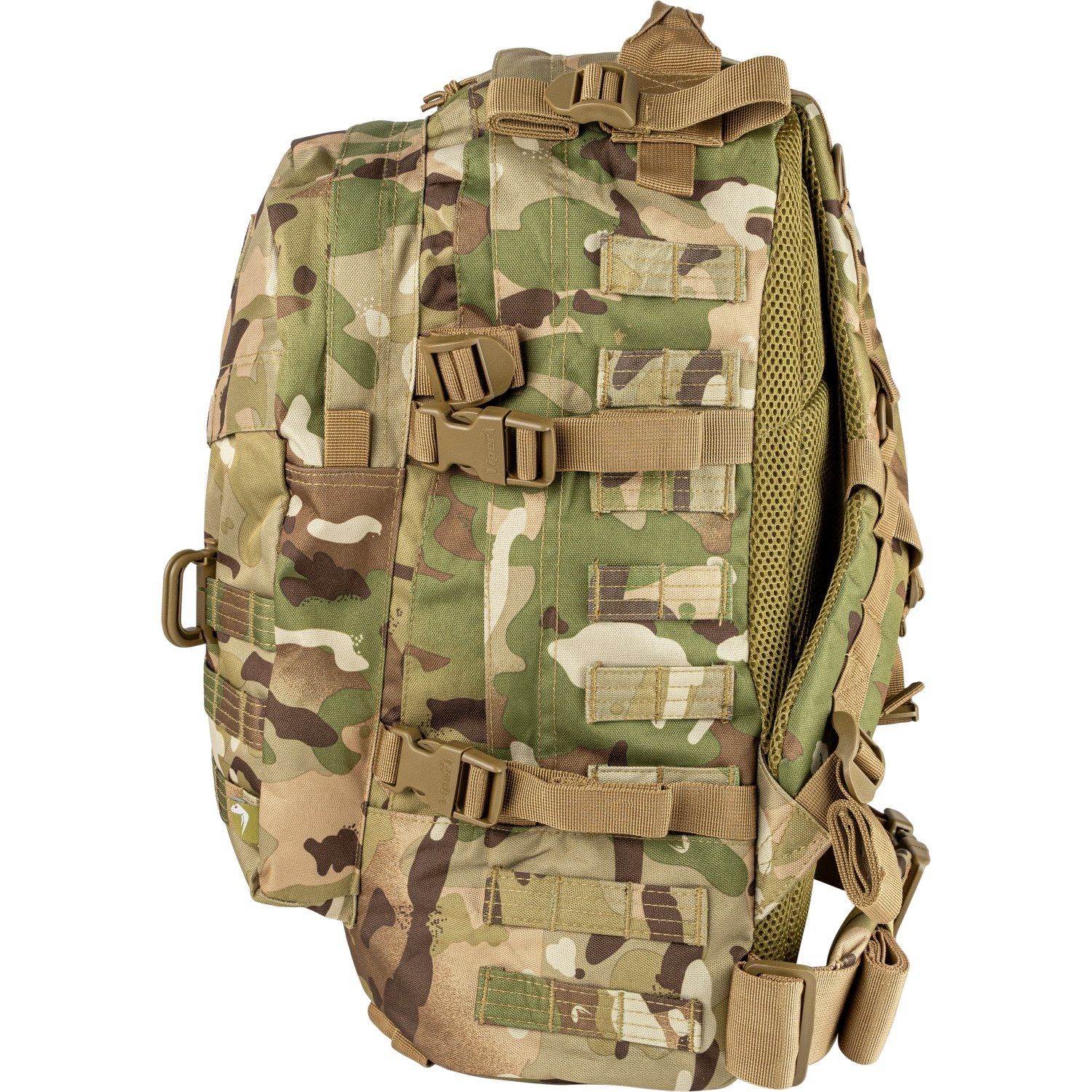 La schiena è piacevolmente imbottita, così come gli spallacci, che sono regolabili insieme alla cintura lombare. Il comfort è ulteriormente migliorato dalla cinghia pettorale regolabile. Gli anelli a D e i moschettoni, che sono parte integrante dello zaino, ne ampliano le caratteristiche funzionali. Le cinghie MOLLE consentono di agganciare ulteriori attrezzature, che possono essere fissate con un laccio elastico. La parte superiore dello zaino è dotata di una rete traspirante che garantisce una ventilazione ottimale.