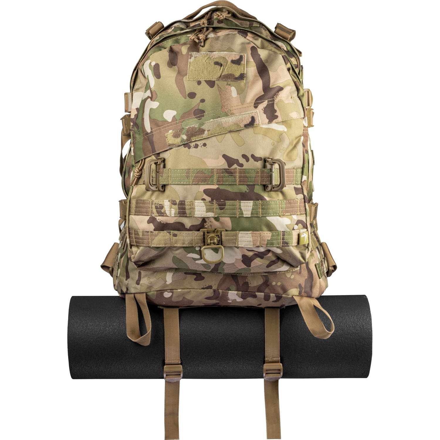 Gli anelli a D e i moschettoni, che fanno parte dello zaino, ne ampliano le caratteristiche di utilità. Le cinghie MOLLE consentono di agganciare ulteriori attrezzature che includono il sistema MOLLE/PALS. Le cinghie laterali regolabili fungono da compressione o aiutano a trasportare un materassino, una giacca, ecc. Tre tasche con cerniera: principale, centrale e frontale.