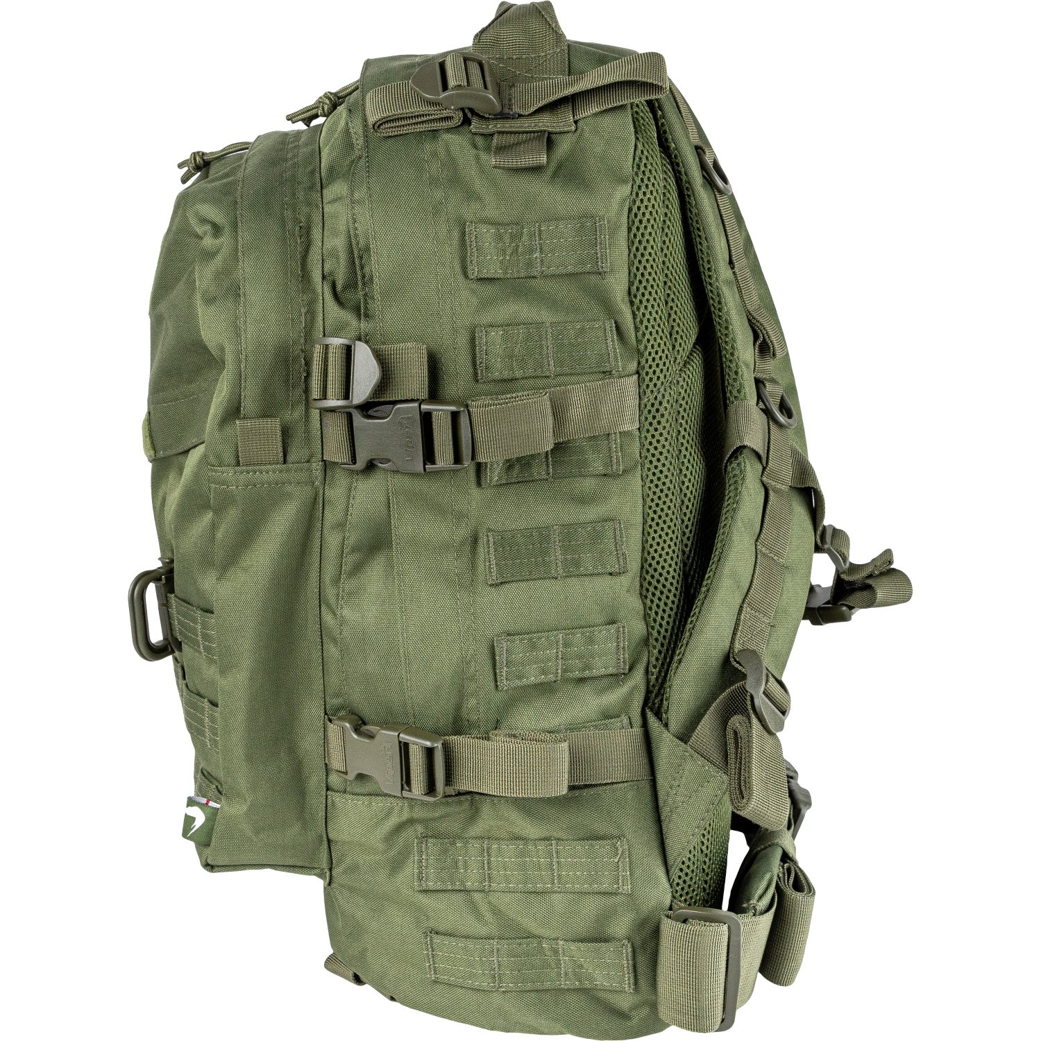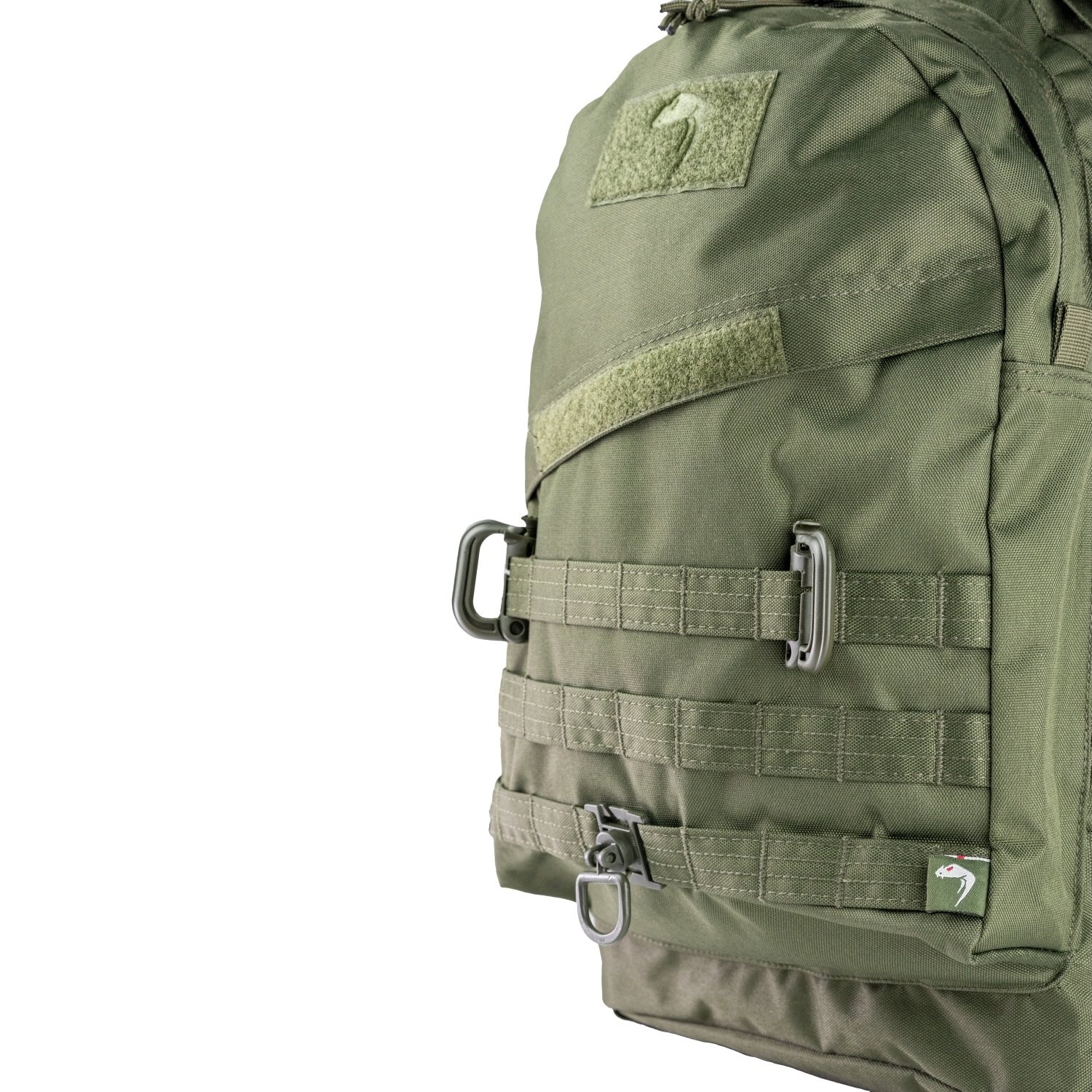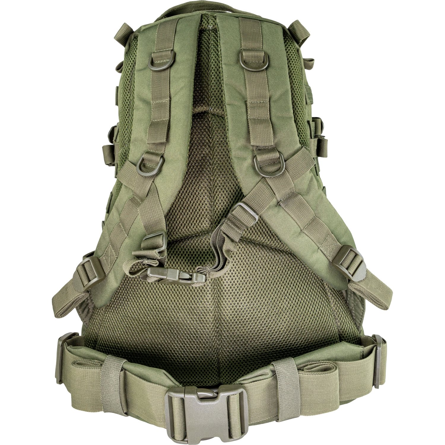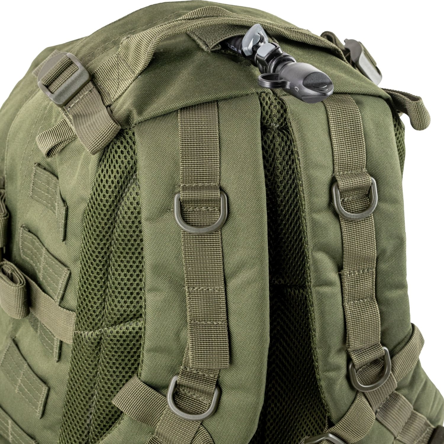La schiena è piacevolmente imbottita, così come gli spallacci, che sono regolabili insieme alla cintura lombare. Il comfort è ulteriormente migliorato dalla cinghia pettorale regolabile. Gli anelli a D e i moschettoni, che sono parte integrante dello zaino, ne ampliano le caratteristiche funzionali. Le cinghie MOLLE consentono di agganciare ulteriori attrezzature, che possono essere fissate con un sistema di cordini.