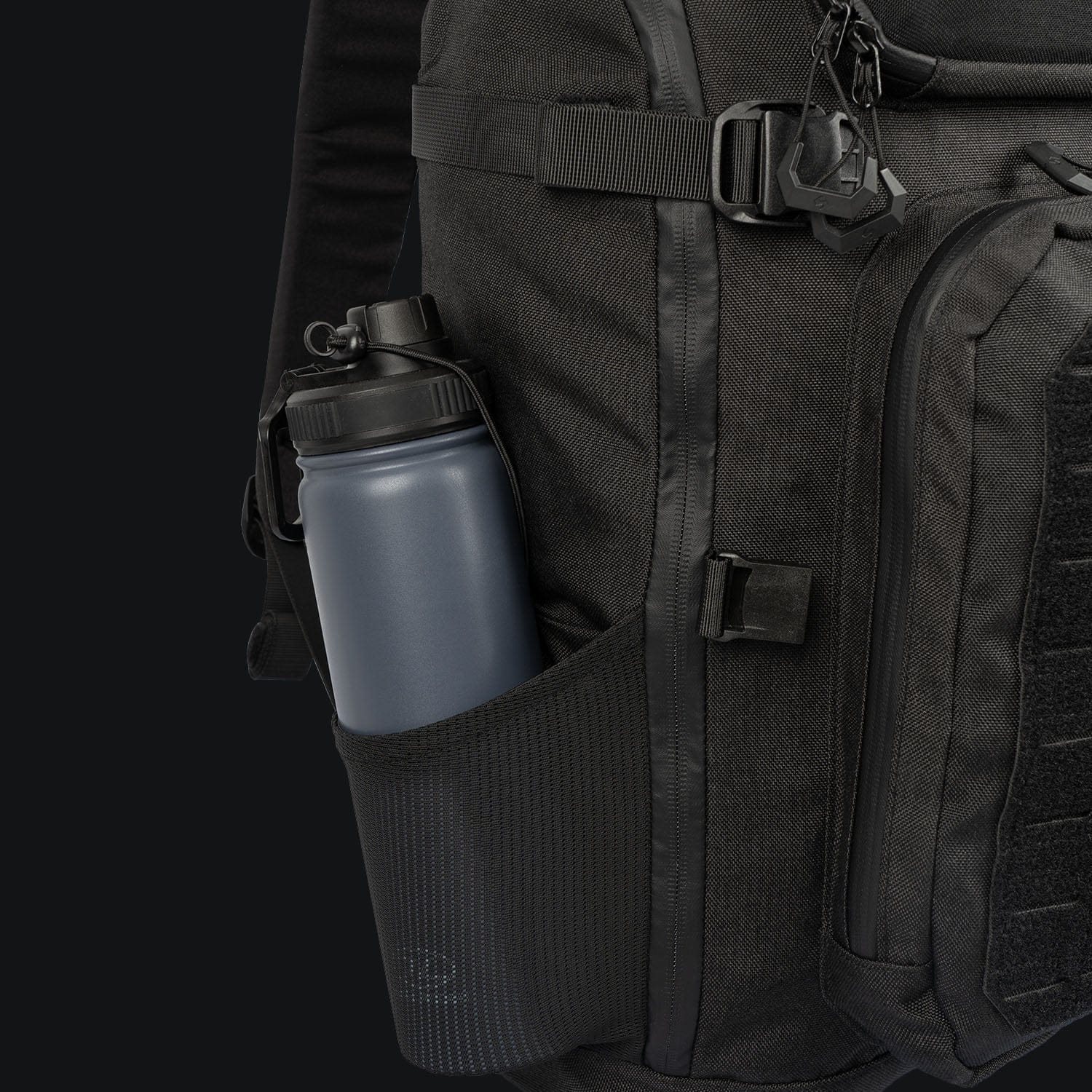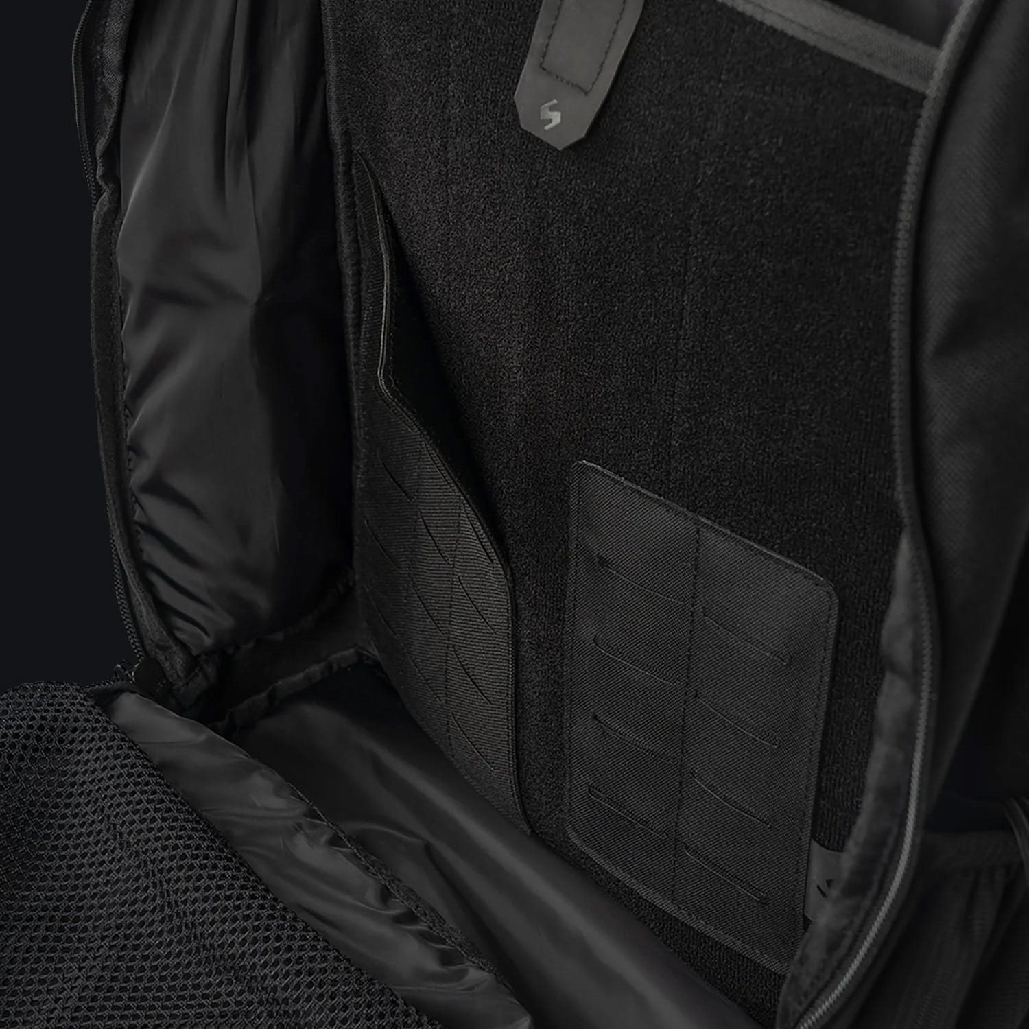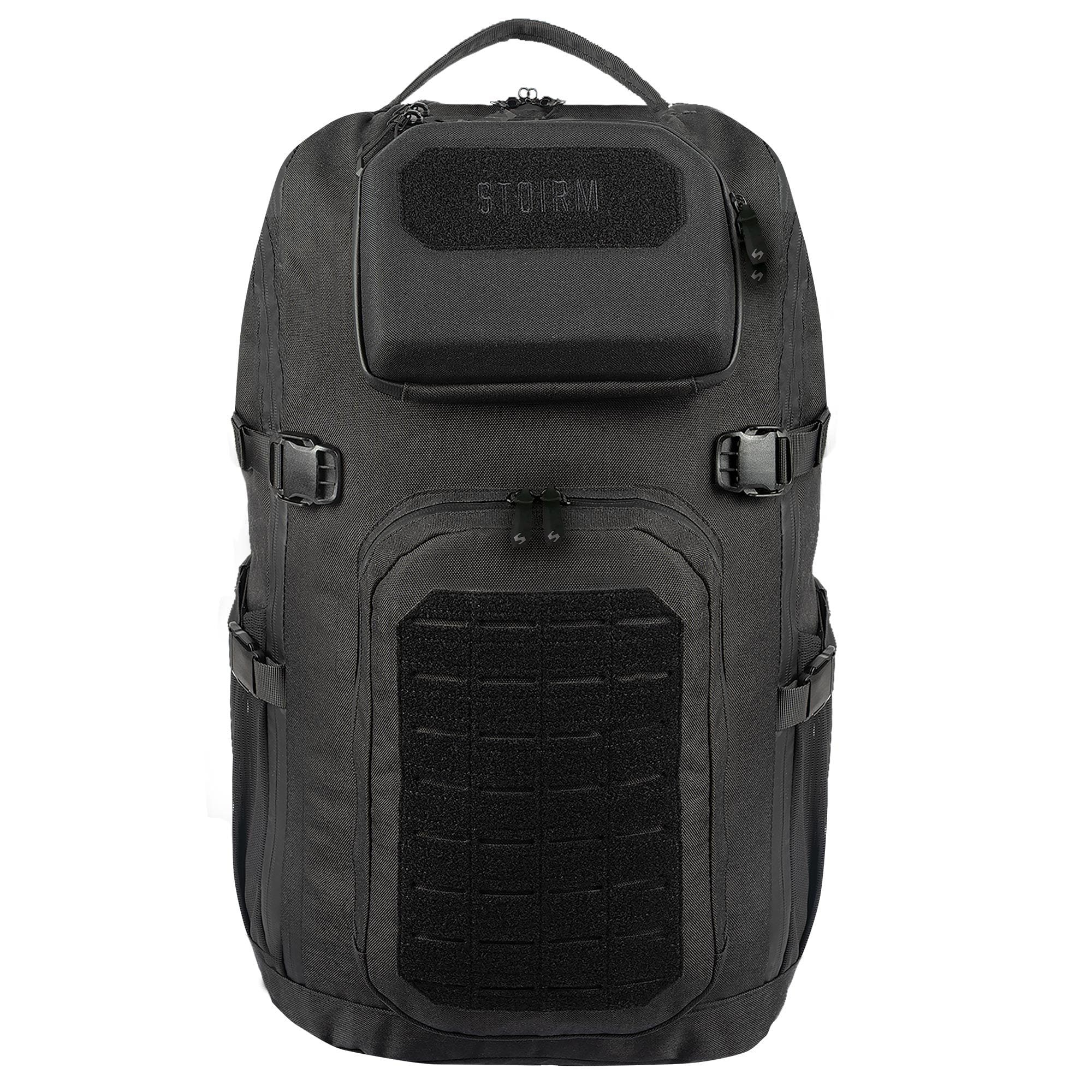 La parte frontale dello zaino è dotata di due tasche sfalsate accessibili tramite cerniere a doppio cursore. La tasca superiore sfalsata è rinforzata per mantenere la forma ed è foderata internamente con morbido pile. La tasca inferiore sfalsata contiene un piccolo organizer, la sua parte esterna è cucita con una trama modulare standard MOLLE/PALS combinata con velcro. Lo scomparto principale è accessibile tramite una cerniera a doppio cursore. All'interno si trovano due tasche in rete, due pannelli staccabili con attacco modulare e uno scomparto imbottito per laptop o sacca idrica con capacità fino a tre litri. Nella parte superiore dello scomparto principale sono presenti passacavi per cavi o tubi della sacca idrica.