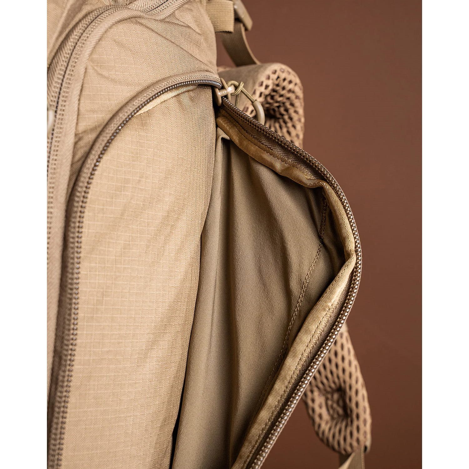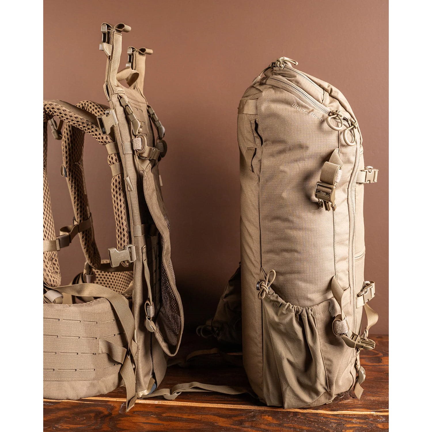 I lati dello zaino sono asimmetrici. Un lato è dotato di una tasca parzialmente elastica per bottiglie, mentre sull'altro lato si trova una tasca elastica allungata accessibile tramite una cerniera a doppio cursore. Su entrambi i lati sono fissate delle cinghie di compressione. La parte frontale è dotata di due scomparti elastici e di un'altra coppia di cinghie di compressione. La tasca superiore all'ingresso è piuttosto piccola, quindi è adatta soprattutto per l'attrezzatura necessaria che si desidera avere sempre a portata di mano. L'ingresso principale all'interno dello zaino è coperto da un coperchio rimovibile con due tasche e un pannello VELCRO relativamente grande per la personalizzazione con toppe in velcro.
