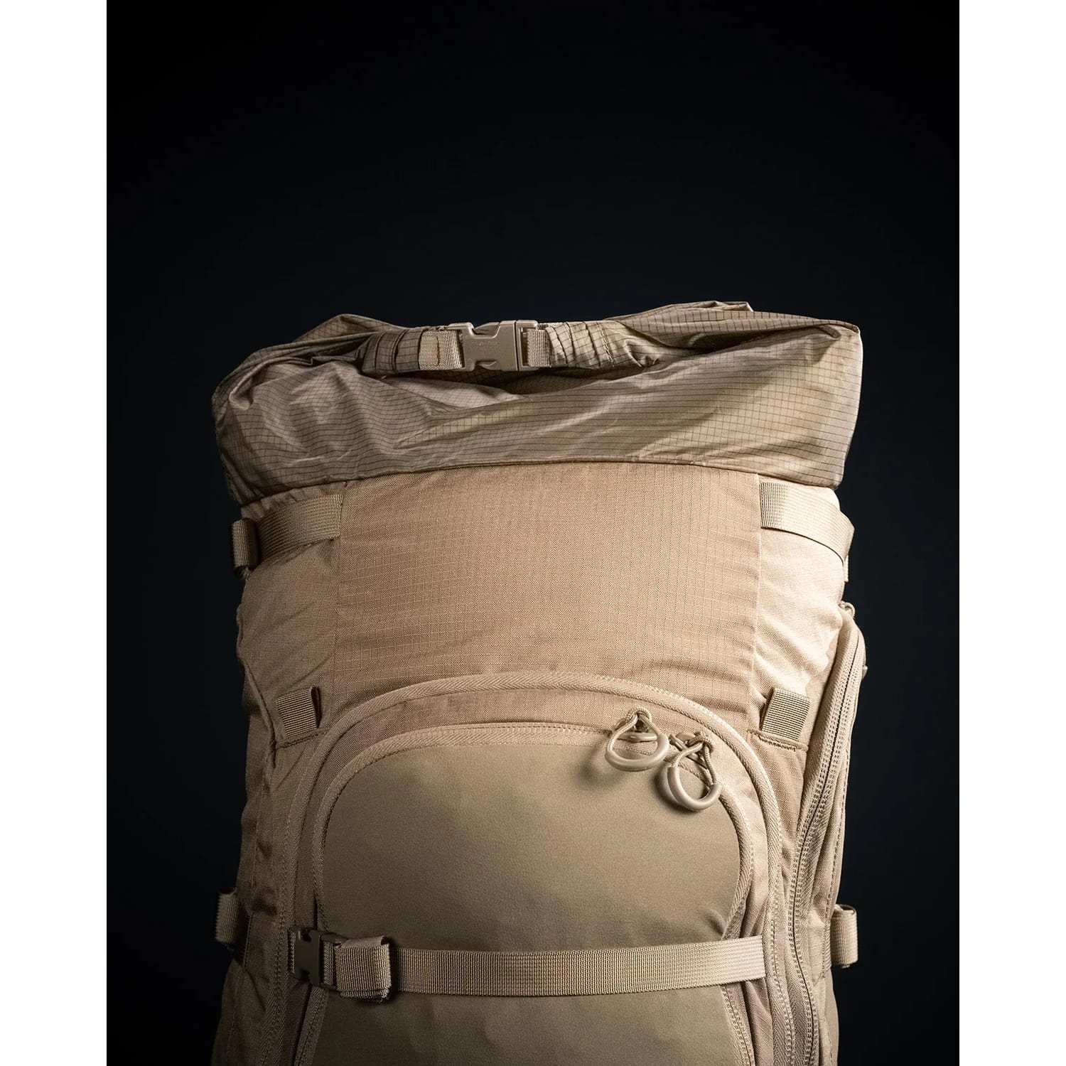 I lati dello zaino sono asimmetrici. Un lato è dotato di una tasca parzialmente elastica per bottiglie, mentre sull'altro lato si trova una tasca elastica allungata accessibile tramite una cerniera a doppio cursore. Su entrambi i lati sono fissate delle cinghie di compressione. La parte frontale è dotata di una grande tasca elastica, dietro la quale si trova una tasca identica ma non elastica. La tasca superiore all'ingresso è particolarmente adatta per l'attrezzatura necessaria che si desidera avere sempre a portata di mano. L'ingresso principale all'interno dello zaino è coperto da un coperchio rimovibile con due tasche e un pannello in VELCRO relativamente ampio per la personalizzazione con toppe in velcro.