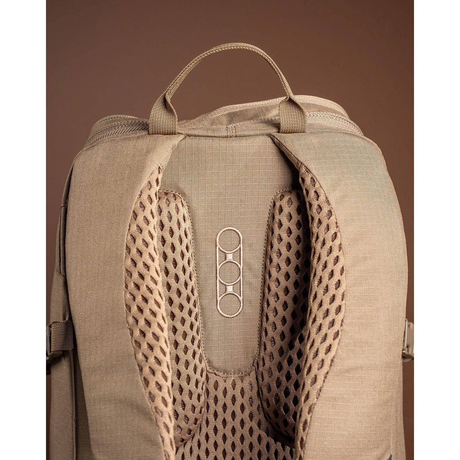 Il sistema dorsale dello zaino è progettato per un trasporto prolungato e soprattutto confortevole con qualsiasi carico. Gli spallacci sono anatomicamente sagomati, fortemente imbottiti con una morbida rete 3D e dotati di una cinghia pettorale regolabile in altezza e ammortizzata con fibbia in plastica. Anche lo schienale è fortemente imbottito e nel cuscino lombare è presente un passante per il fissaggio di un giubbotto lombare (non incluso nella confezione). Nella parte superiore dello schienale è presente una semplice maniglia per il trasporto.