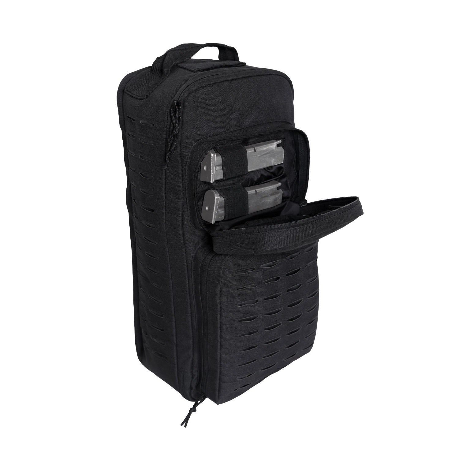Il sistema di aggancio MOLLE inciso al laser si trova sulla tasca frontale inferiore e sui lati dello zaino. Nella parte superiore dello zaino è presente una maniglia semplice e ampia per il trasporto a mano. Zaino con sistema di aggancio MOLLE inciso al laser.